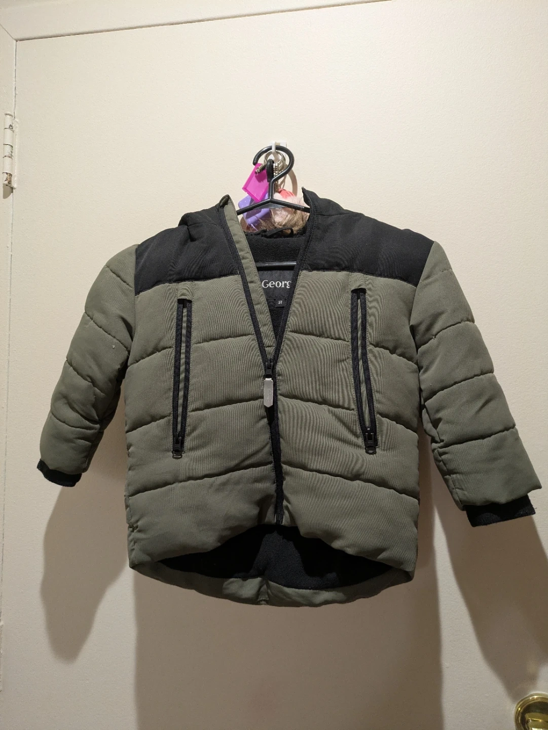 Selling a gently used George puffer jacket in size 3T. It's a stylish and warm jacket perfect for keeping your little one cozy during colder weather. Features a combination of olive green and black colours.