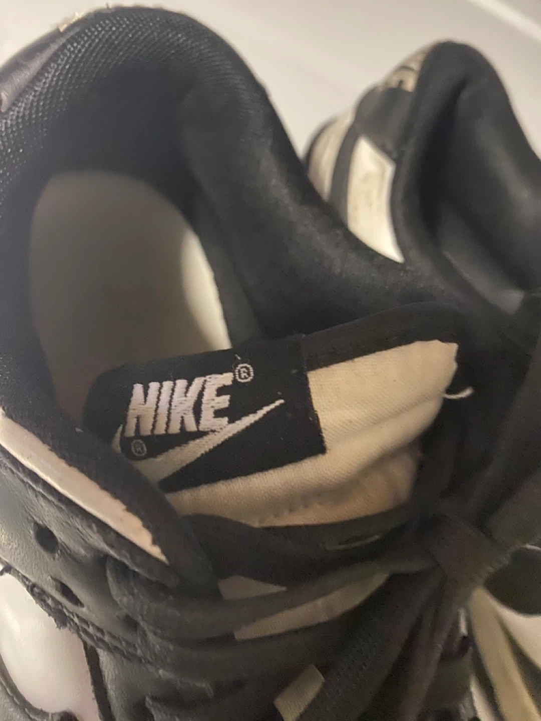 Selling a pair of Nike Dunk Low Panda sneakers in size 9.5. They're in okay condition with some signs of wear, as shown in the photos. A classic style that goes with everything!
