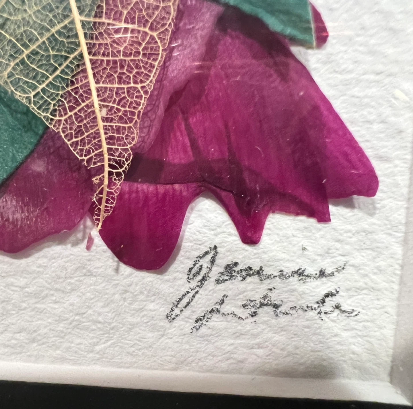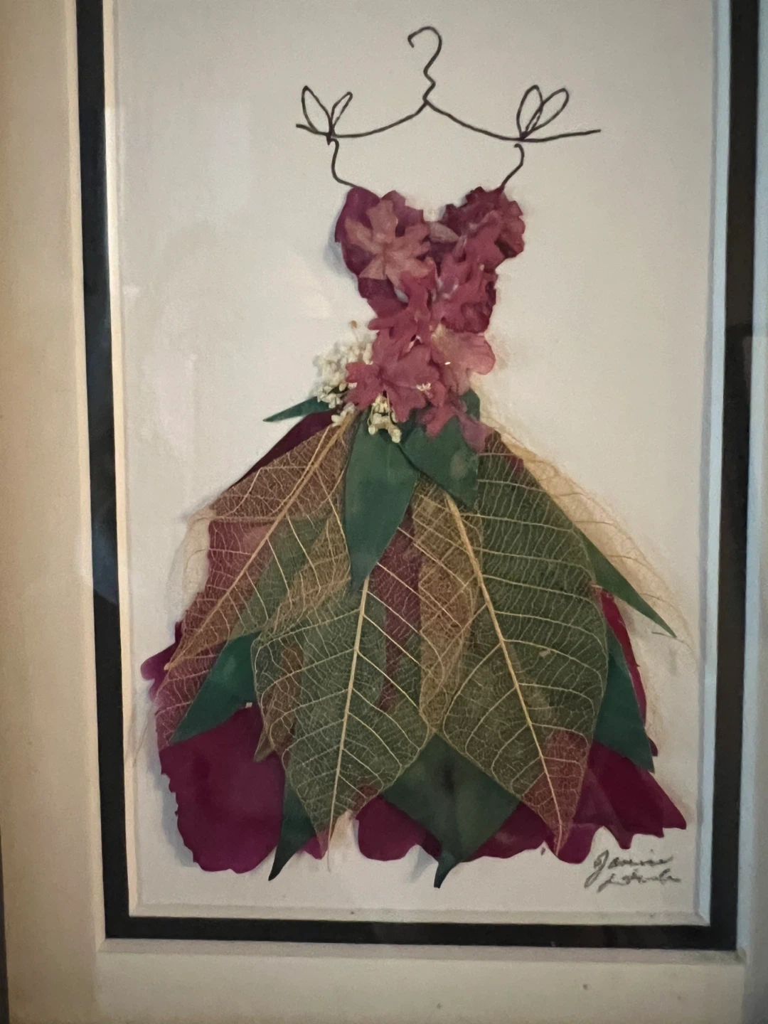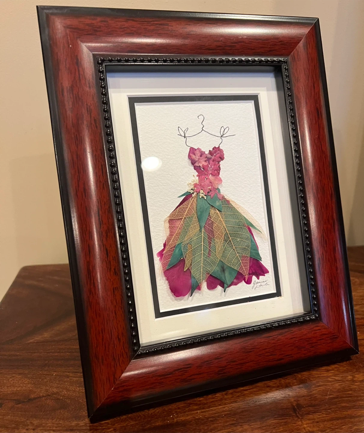 Collage of real, pressed leaves and flowers arranged to form a dress design on a paper background