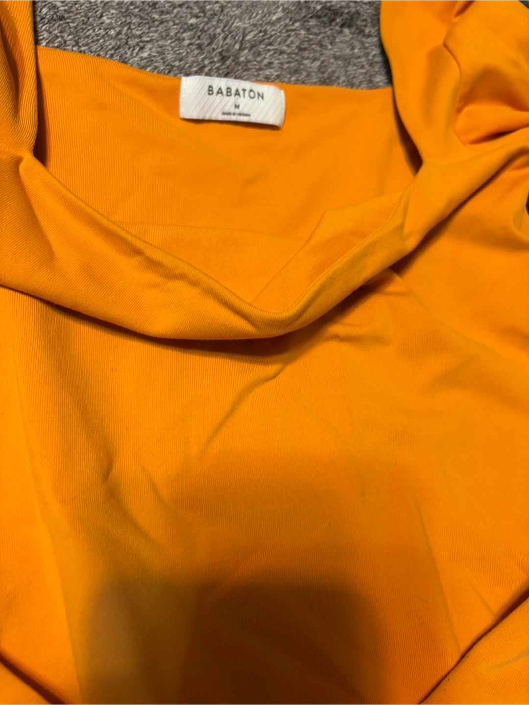 vibrant orange bodysuit from Babaton! It's a size medium and in great condition. The material feels soft and comfortable, perfect for adding a pop of colour to your wardrobe