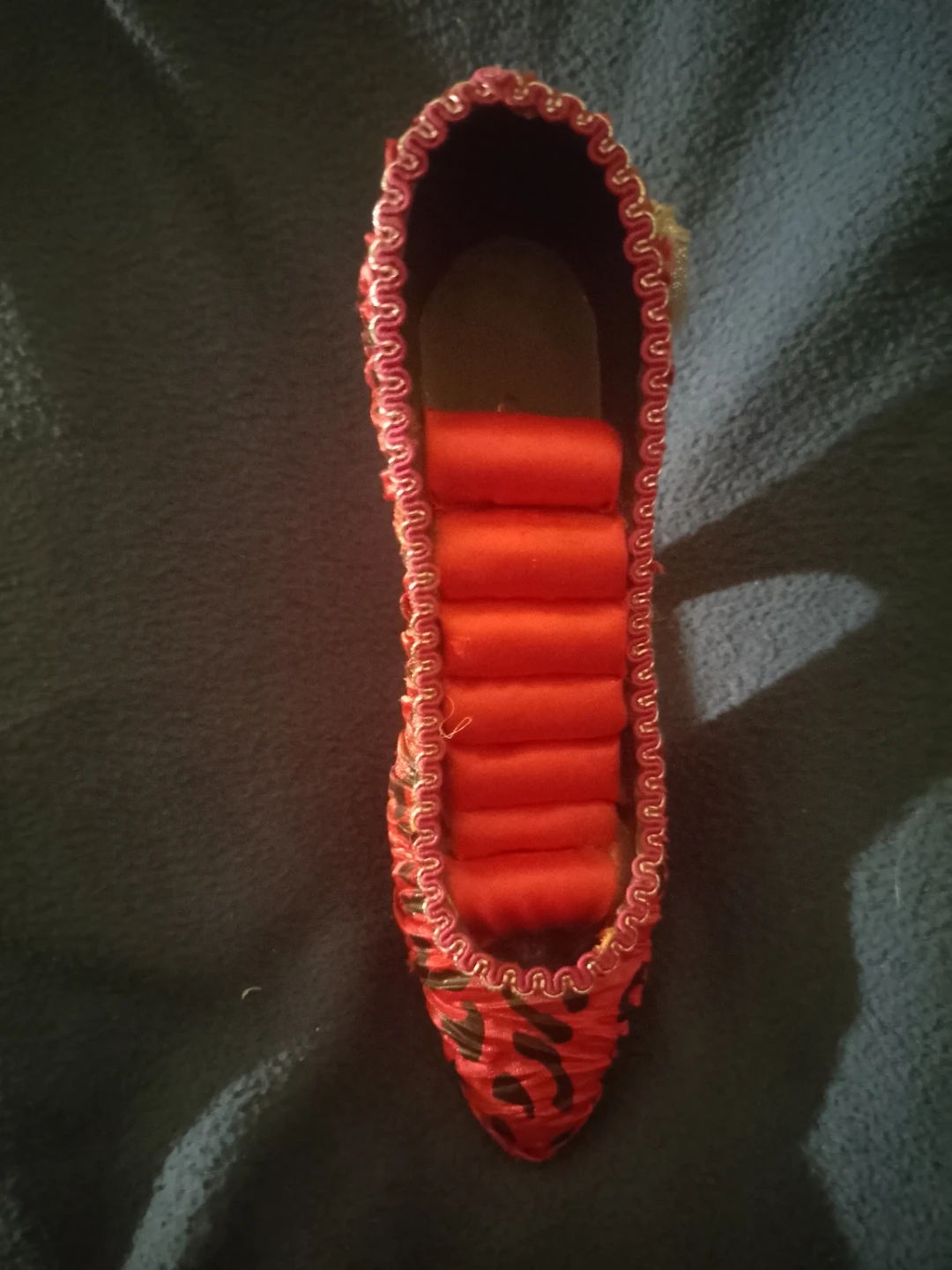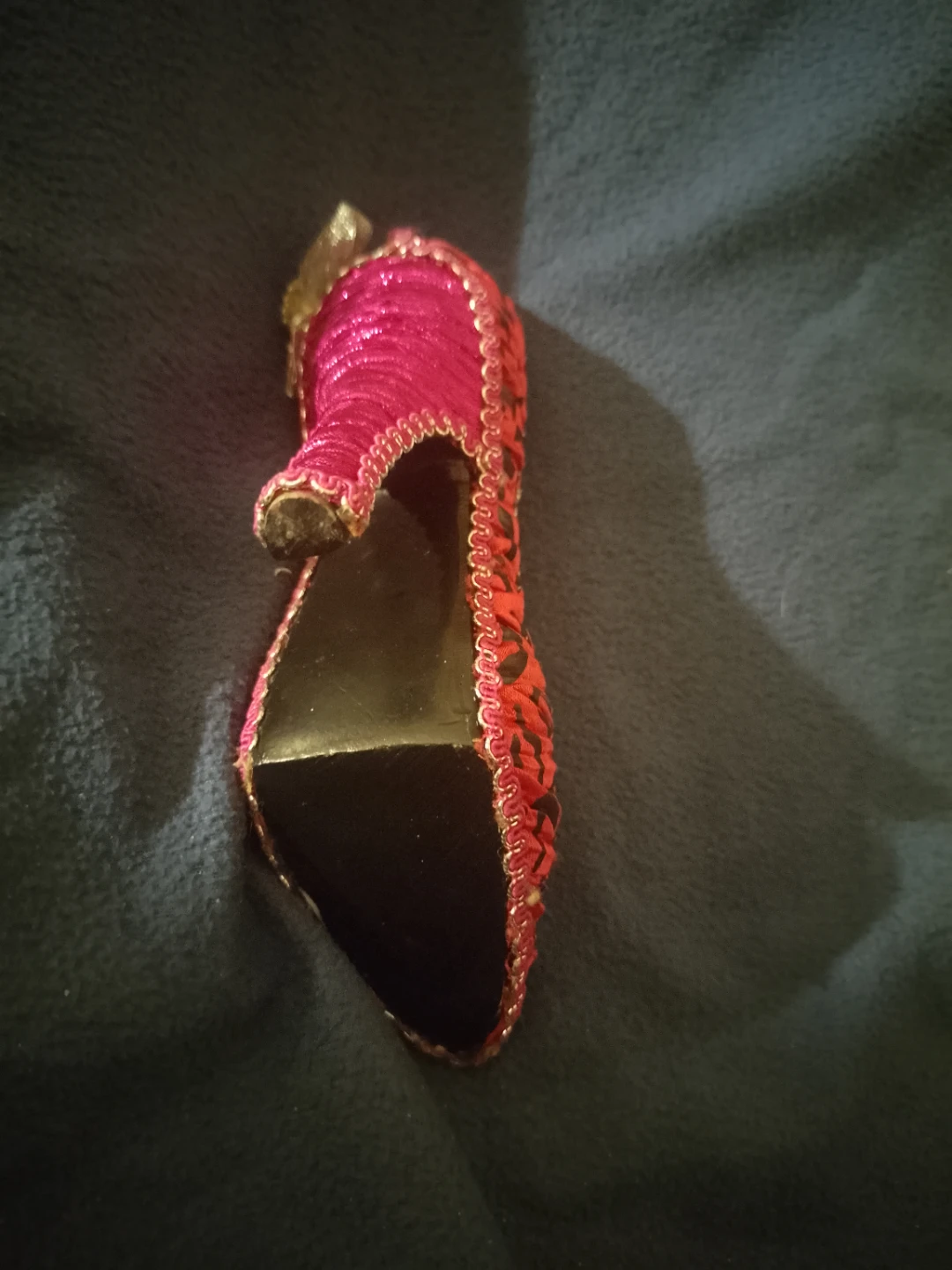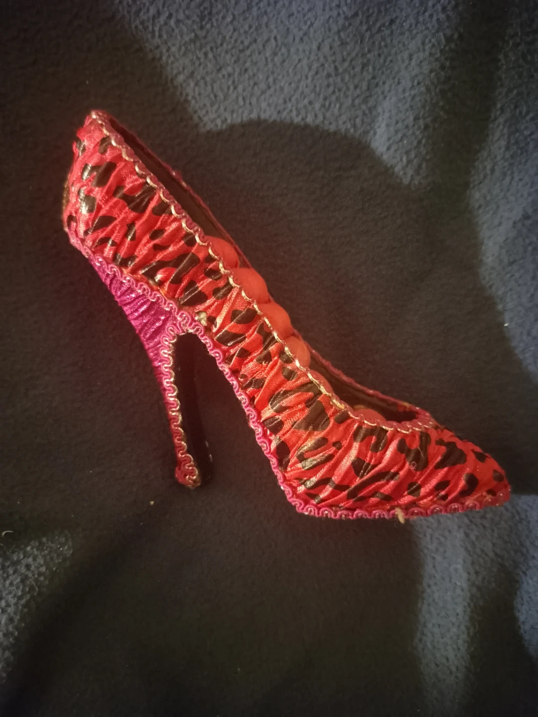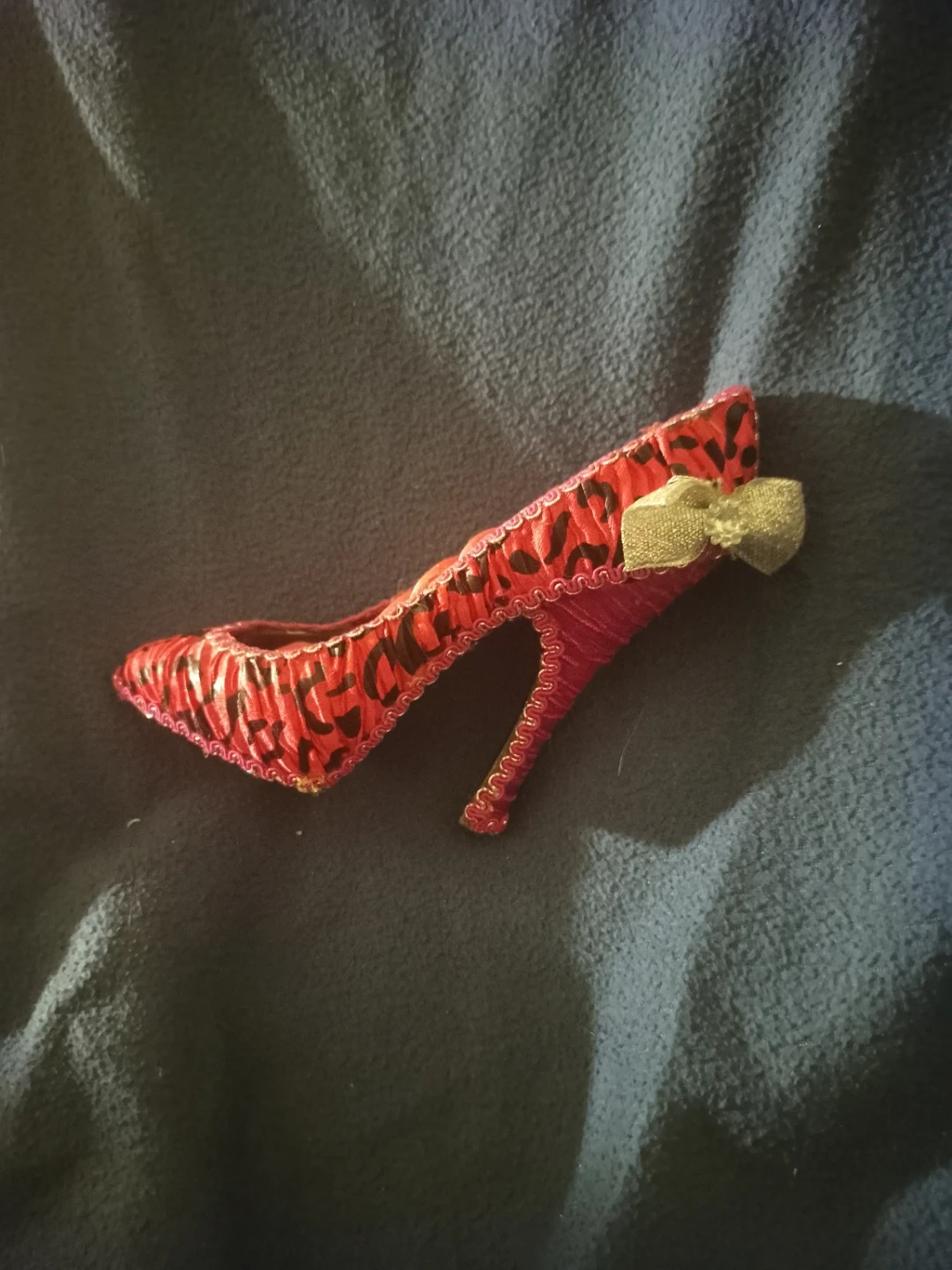 Selling a decorative high heel shoe, perfect for display! It features a vibrant red colour with black accents and a cute little bow on the back. Would look great in a collection or as a unique piece of decor