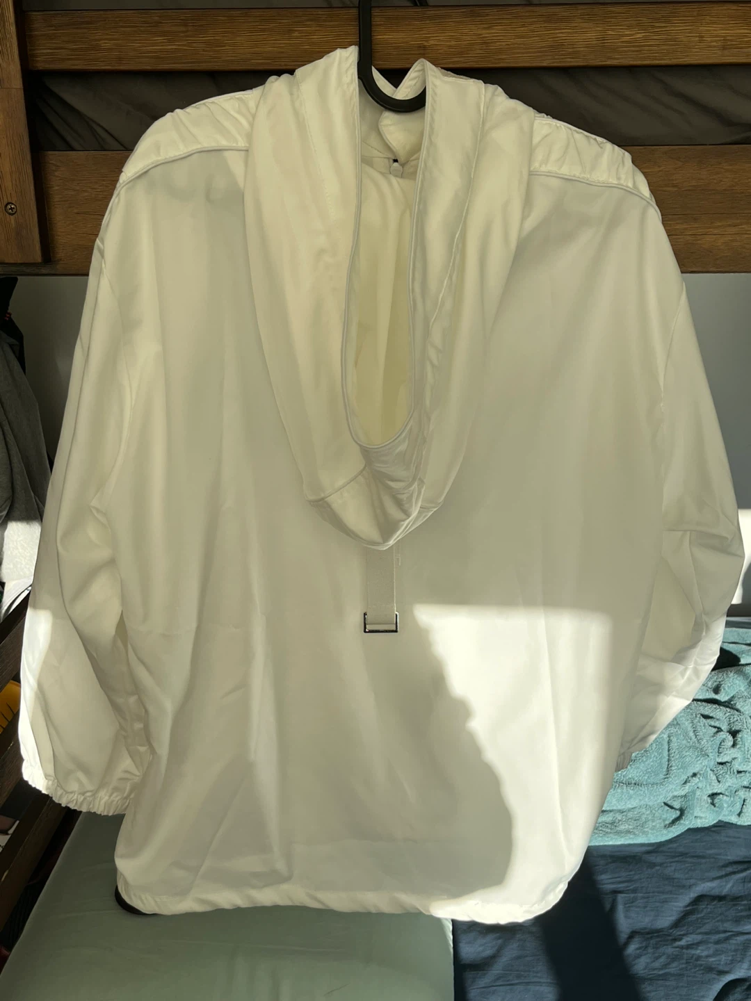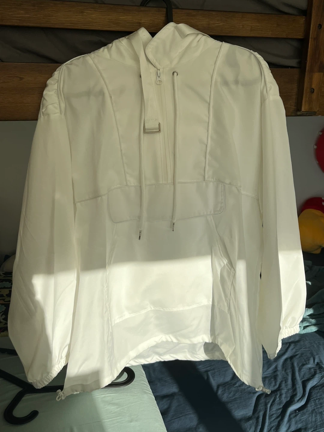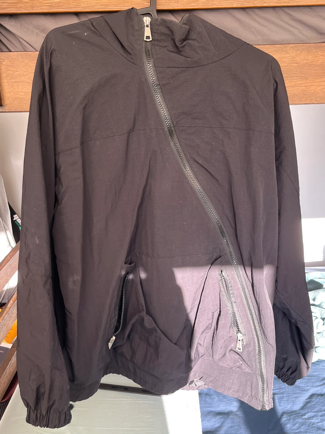 Selling a hooded jacket with an asymmetrical zipper. It's lightweight and great for layering. Available in both black and white.