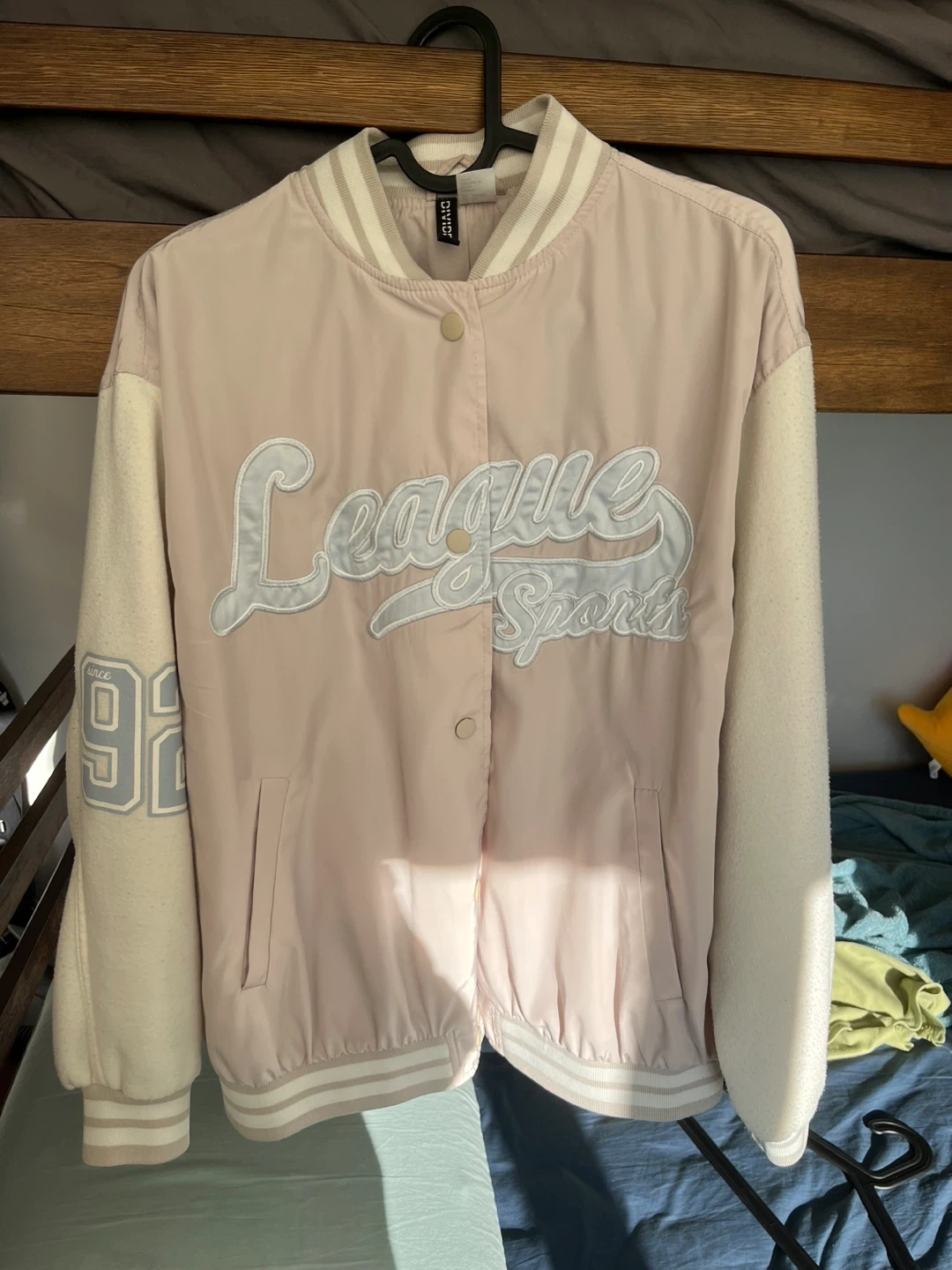 Selling a cute H&M Divided varsity jacket in size small! It's a light pink colour with white sleeves and "League Sports" embroidered on the front. Perfect for layering or adding a sporty touch to your outfit