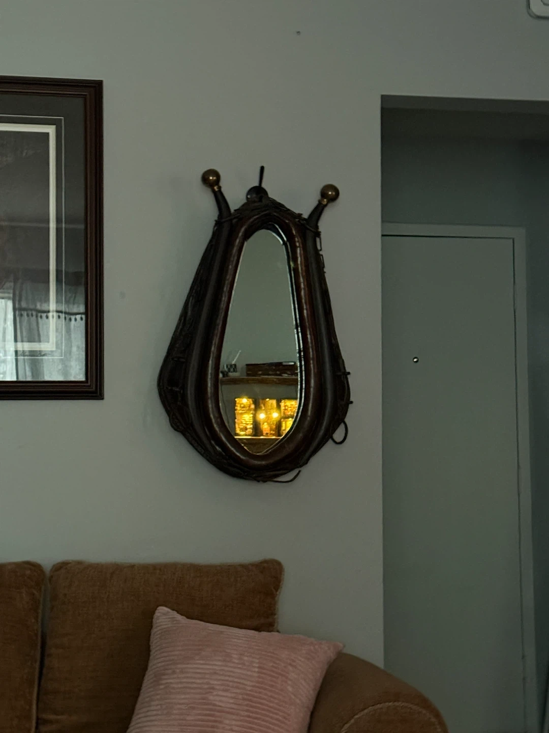 Add a touch of rustic charm to your home with this unique horse collar mirror. It's a real statement piece that's sure to catch the eye. The mirror is in good condition and ready to hang. Perfect for adding a vintage feel to any room!