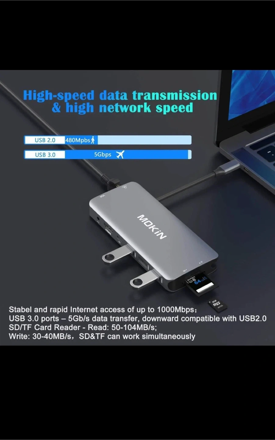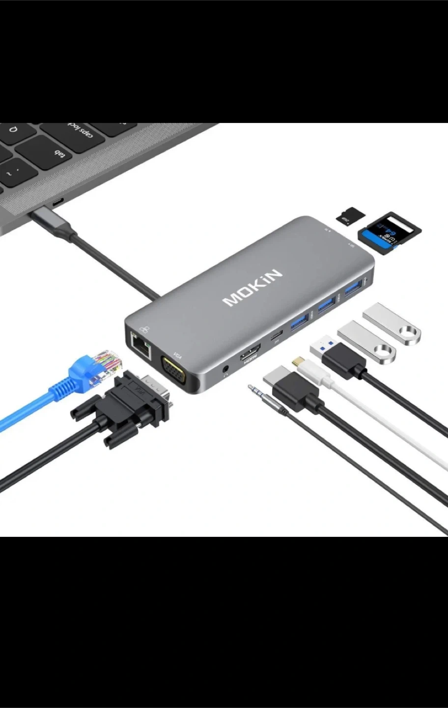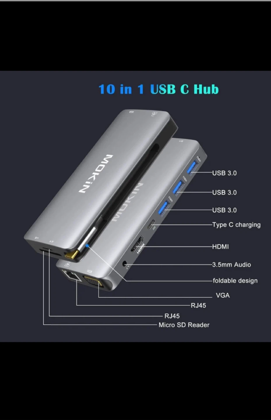 Selling a Mokin USB-C 10 in 1 Multifunctional Hub. It supports 4K@60Hz (Max), VGA, USB 3.0, up to 5Gbps data speed, SD/Micro SD Card Reader, RJ45 and 3.5mm Audio. Also supports input 100W Max