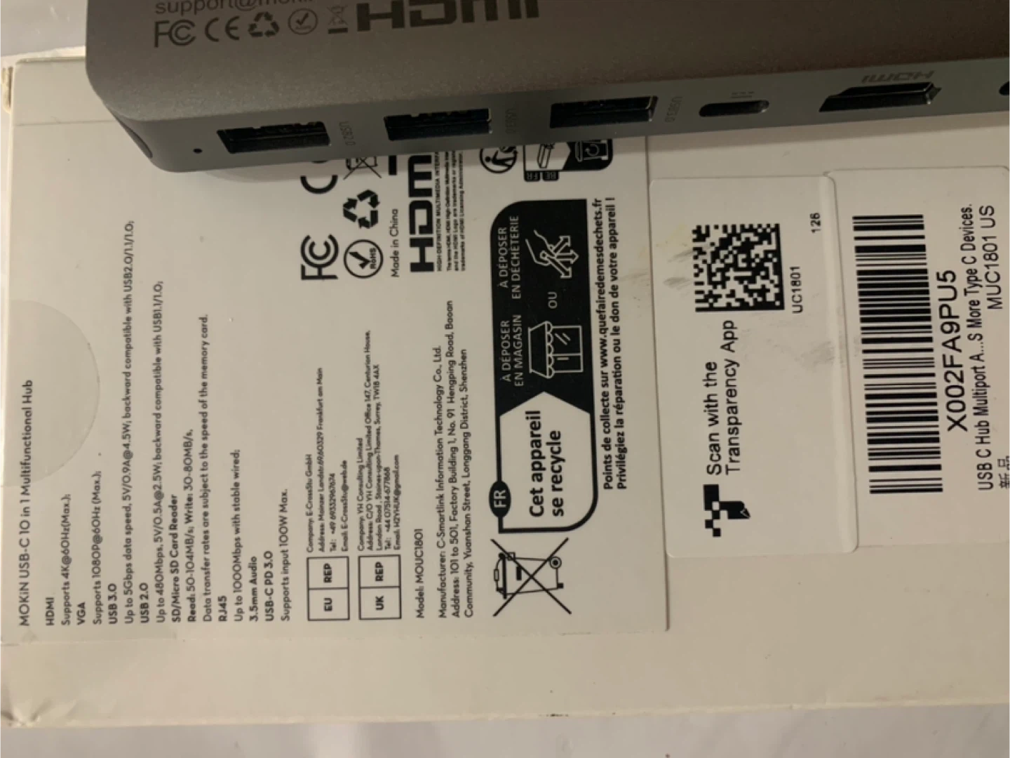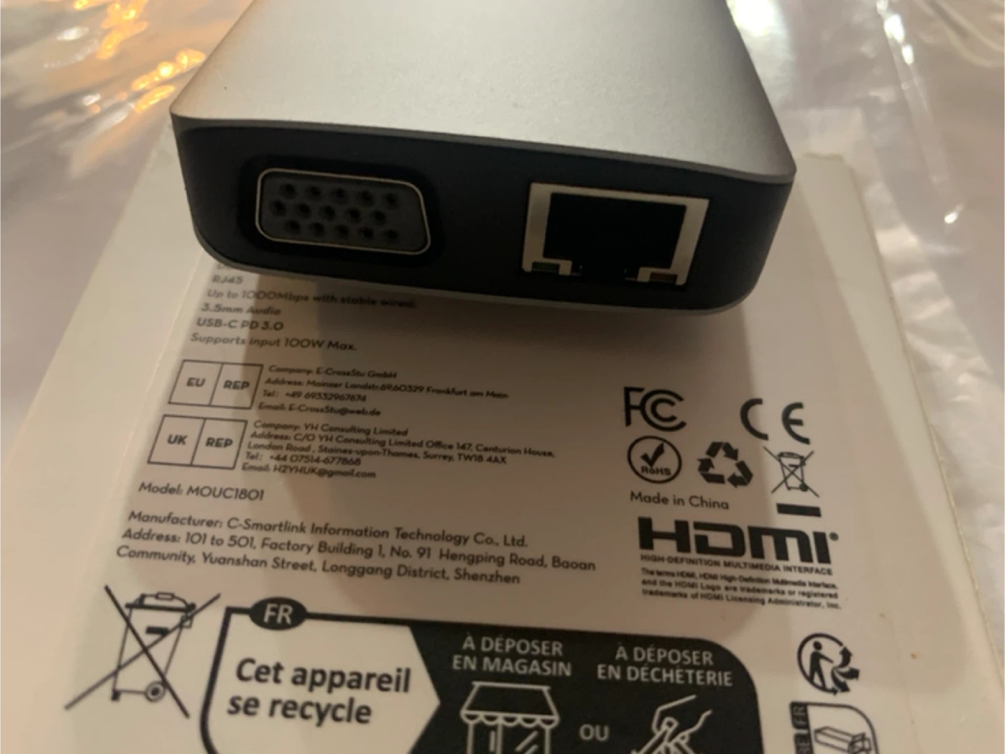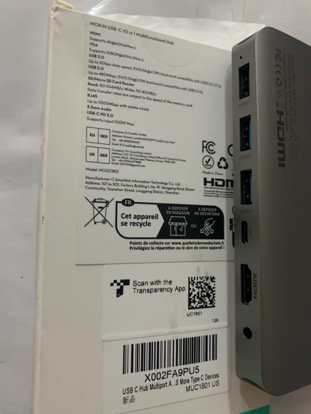 Selling a Mokin USB-C 10 in 1 Multifunctional Hub. It supports 4K@60Hz (Max), VGA, USB 3.0, up to 5Gbps data speed, SD/Micro SD Card Reader, RJ45 and 3.5mm Audio. Also supports input 100W Max