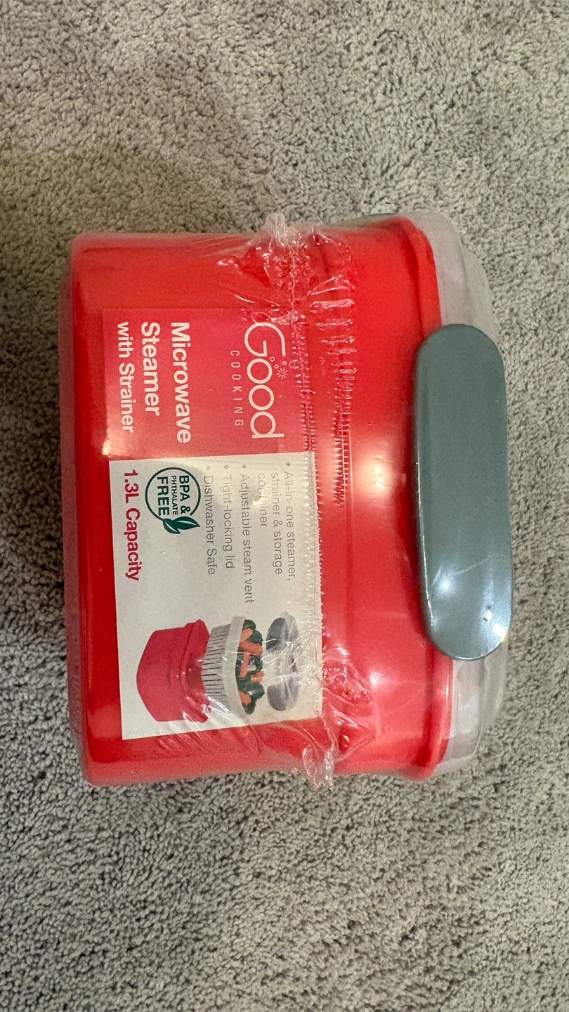 I'm selling a Good Cooking microwave steamer with a strainer. It's brand new and still in its original packaging! It's BPA and phthalate-free and dishwasher safe. The capacity is 1.3L and it features an adjustable steam vent and a tight-locking lid. This is great for steaming veggies or other foods in the microwave