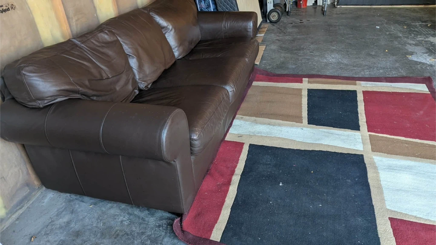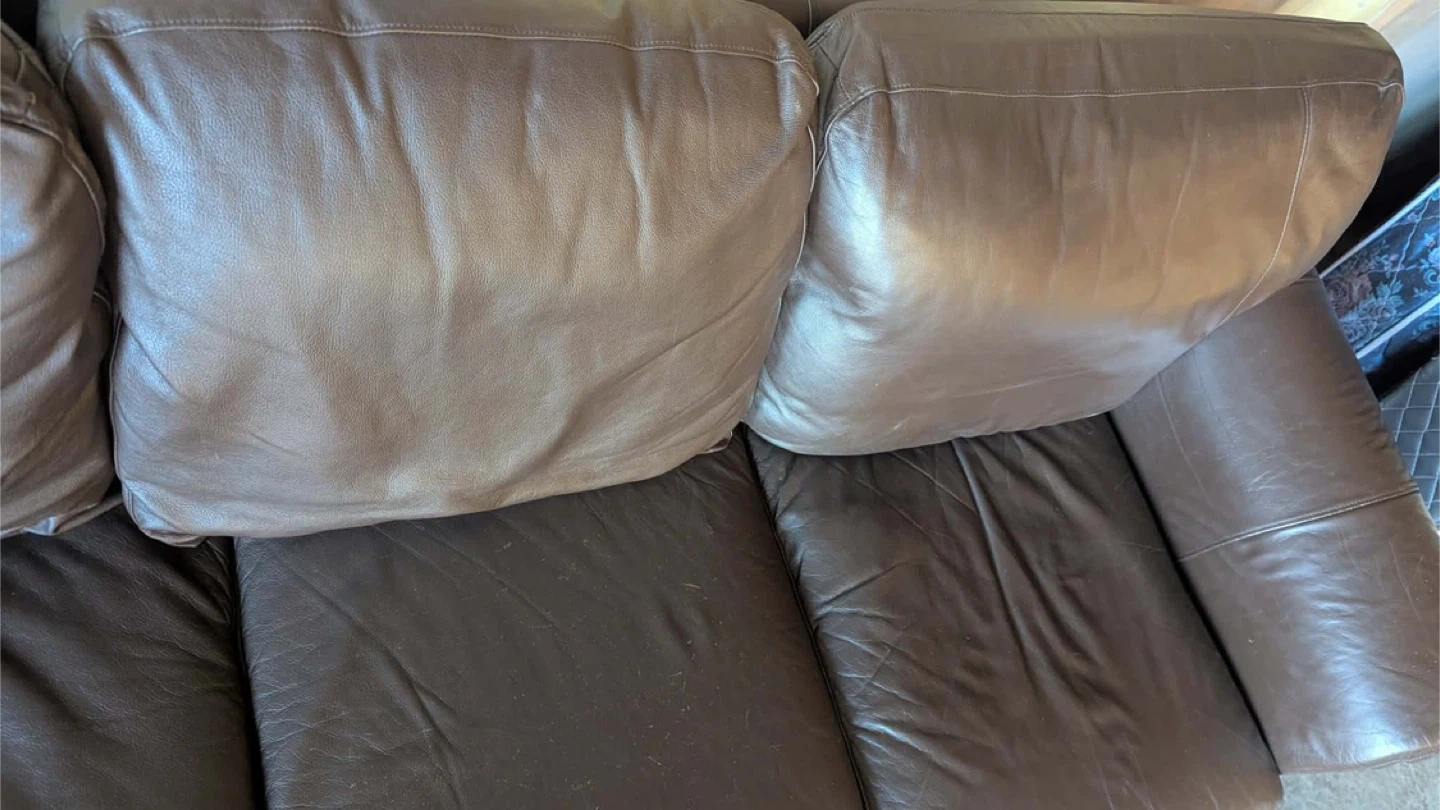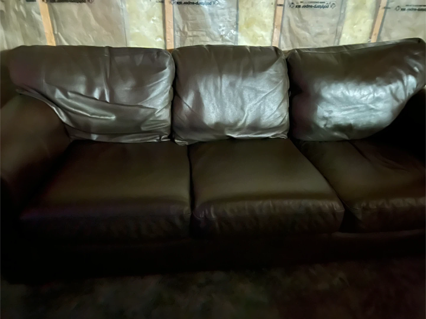 Selling a comfy three-seat sofa! It's a dark brown leather and would be great for a living room or rec room or basement it’s very comfortable no damaged no scratches non smoking house no pets