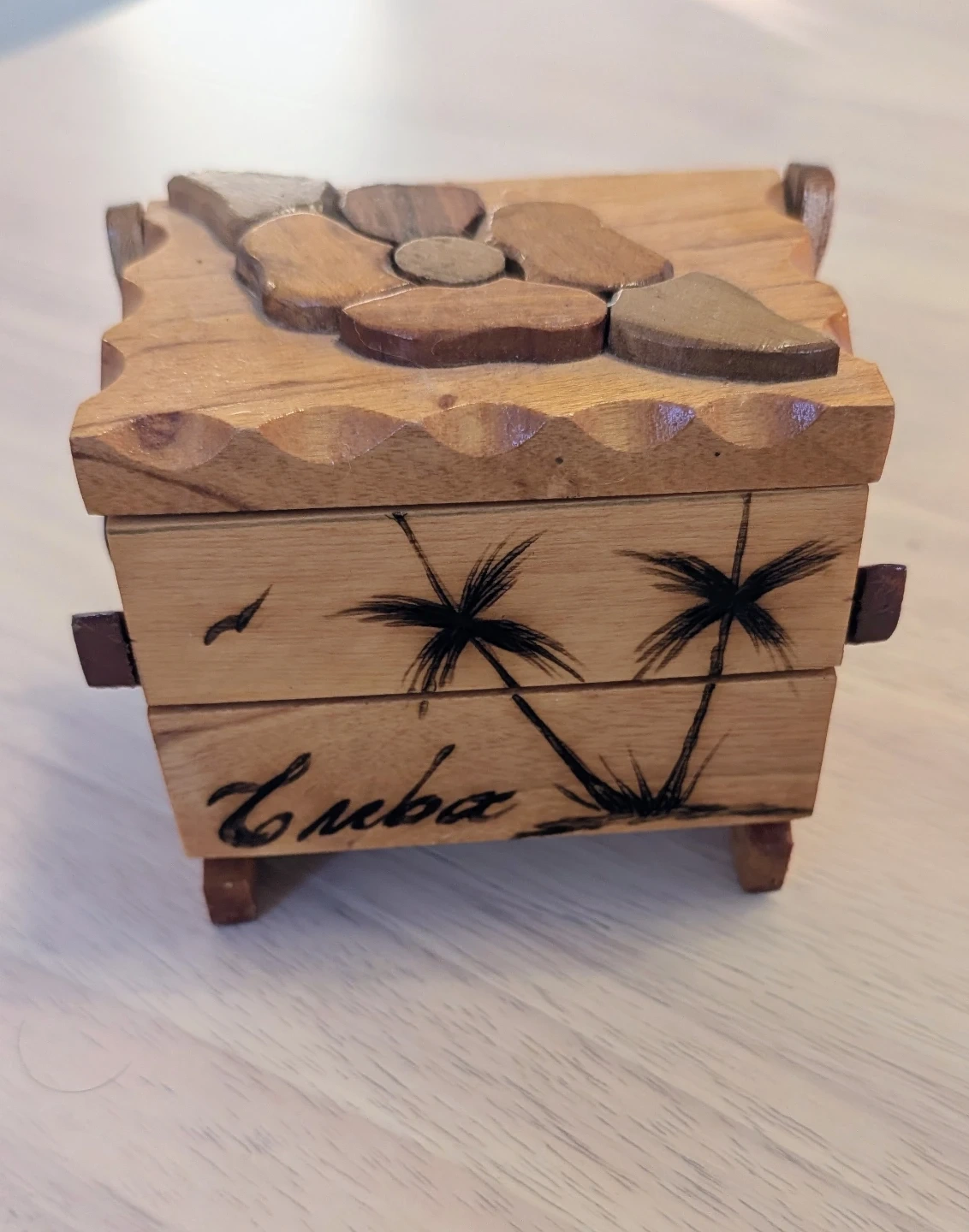 A cute little wooden trinket box featuring a design with palm trees and the word 'Cuba' on the front. The inside is lined with red felt, and the lid has a floral design. Perfect for storing small jewelry or keepsakes