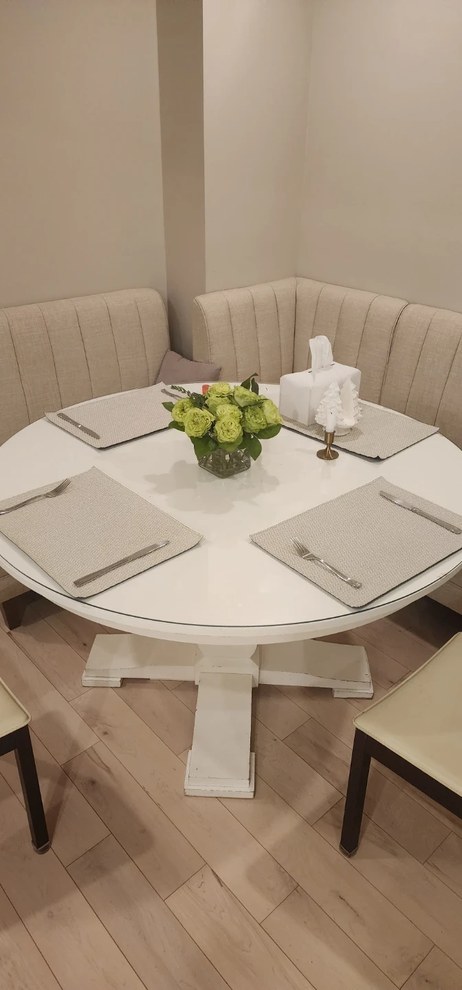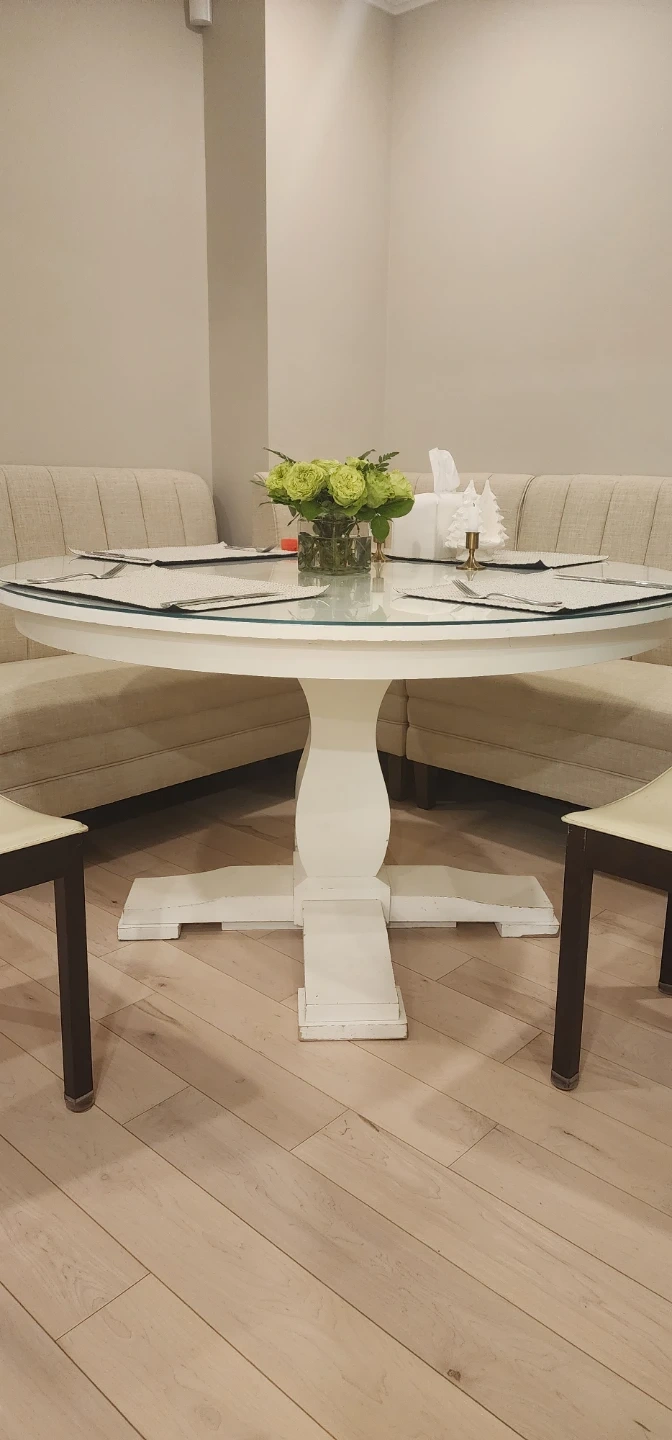 Selling a round dining table with custom made glass top. Table has marks on the surface and on the legs and could use a coat of paint. It is very sturdy and sets up to 6 people.