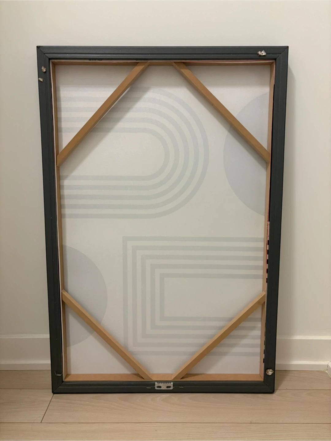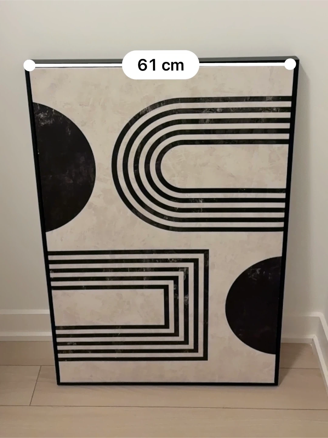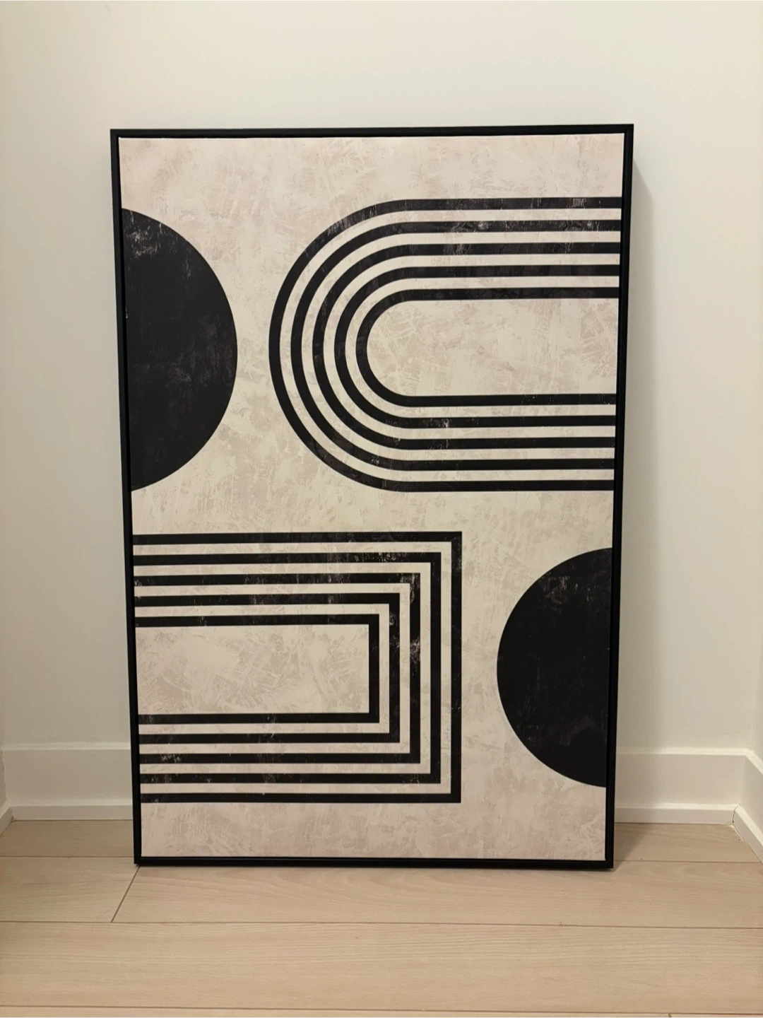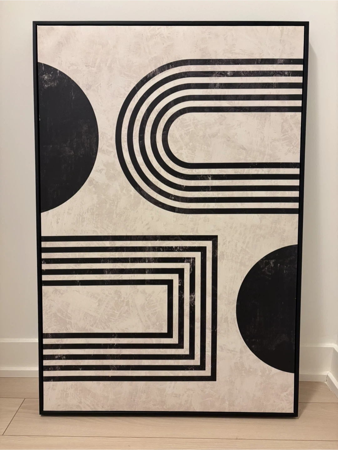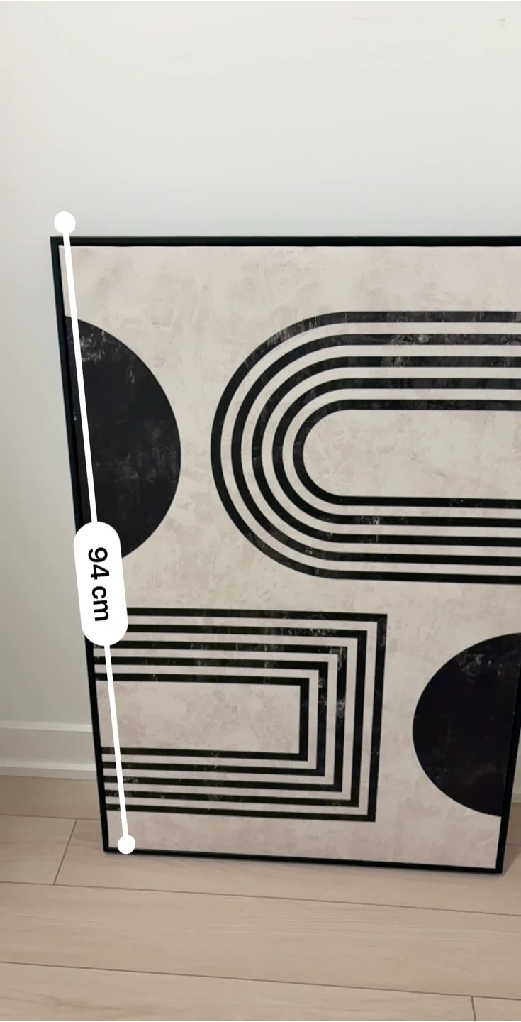 Here's a piece of geometric wall art from Homesense that would look great in any room! It features black and white shapes on a textured background. The dimensions are 94cm x 61cm. Original price was 100$ + tax . Selling for 45$