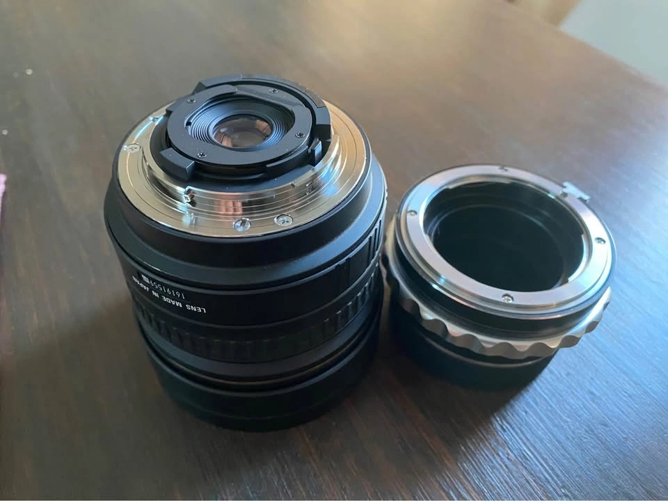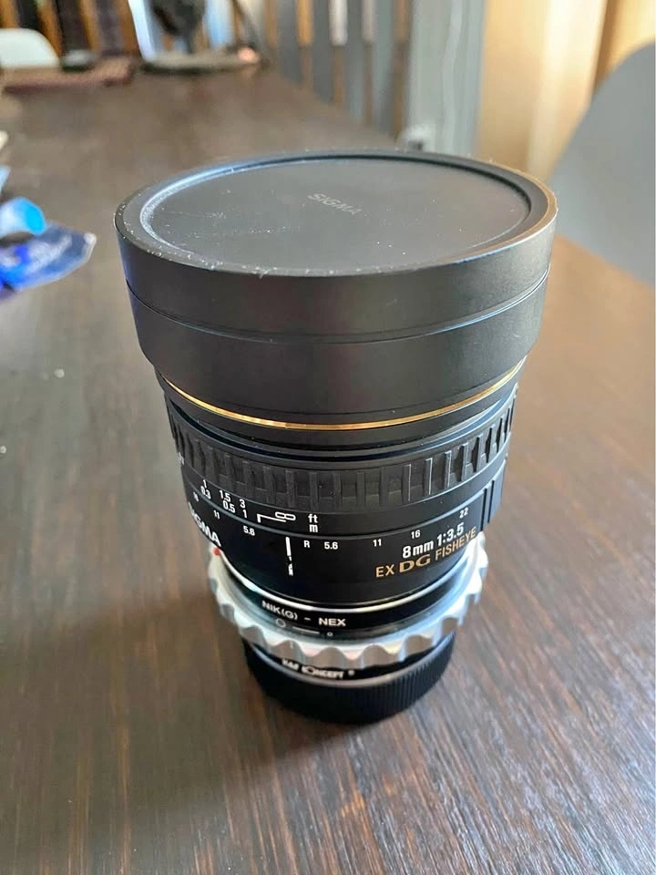 Sigma 8mm f/3.5 EX DG Circular Fisheye lens – quality lens with nice glass (no marks or scratches on glass). Nikon F-mount. Comes with Nikon to Sony E-mount adapter - was used to take high resolution 360 panorama photos on Sony mirrorless camera (a6000). Worked great. Hardly used.