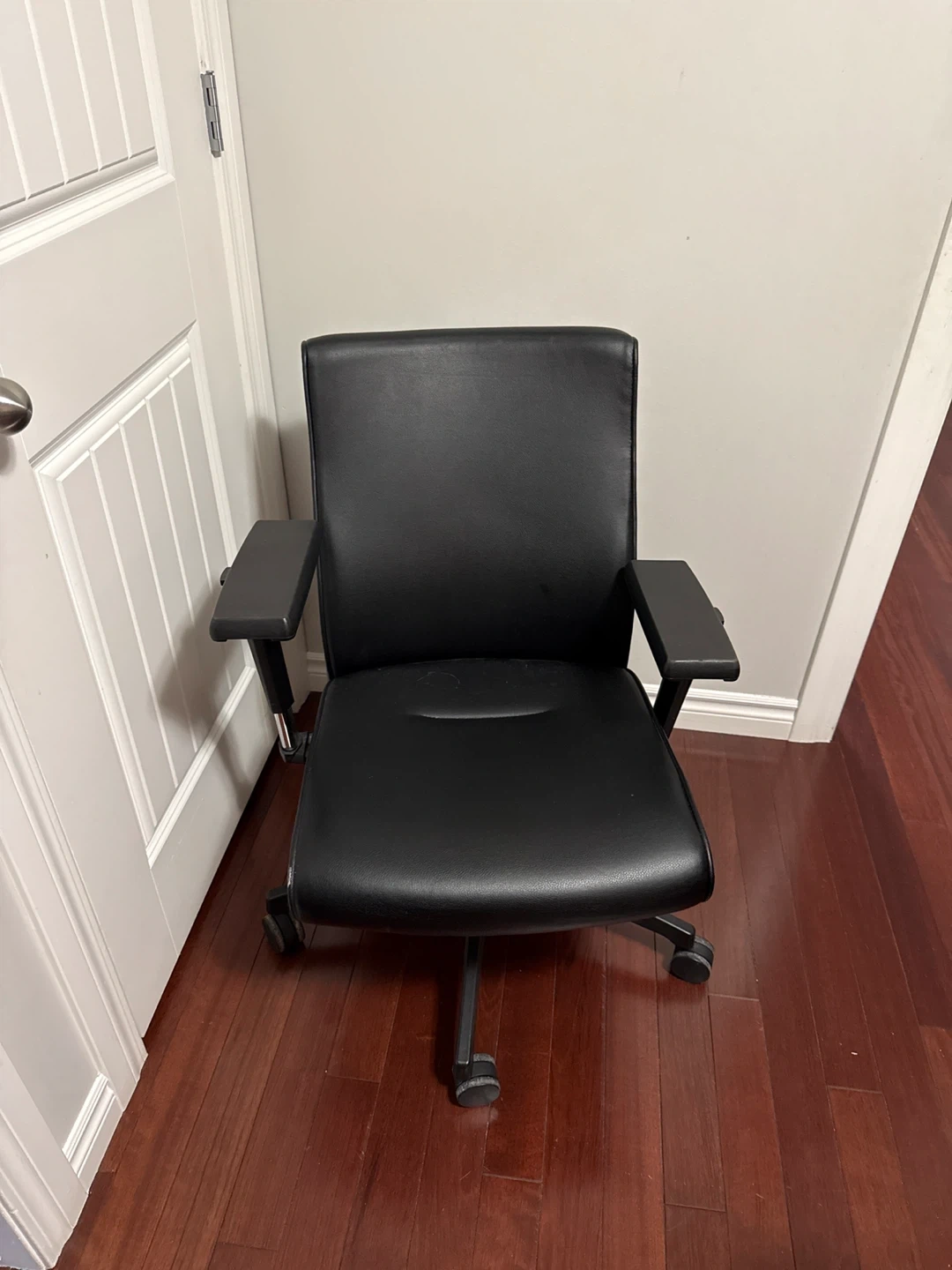 Selling a gently used black office chair. It's in great shape and ready for a new workspace! The chair features a comfortable seat and back, adjustable armrests, and smooth-rolling casters