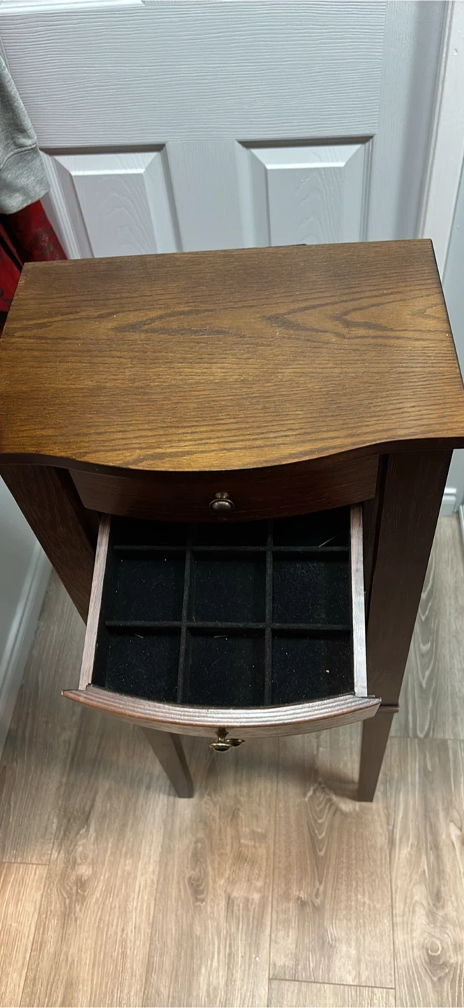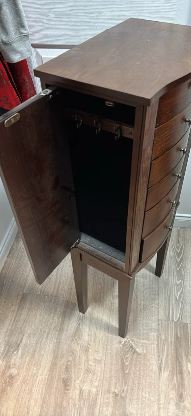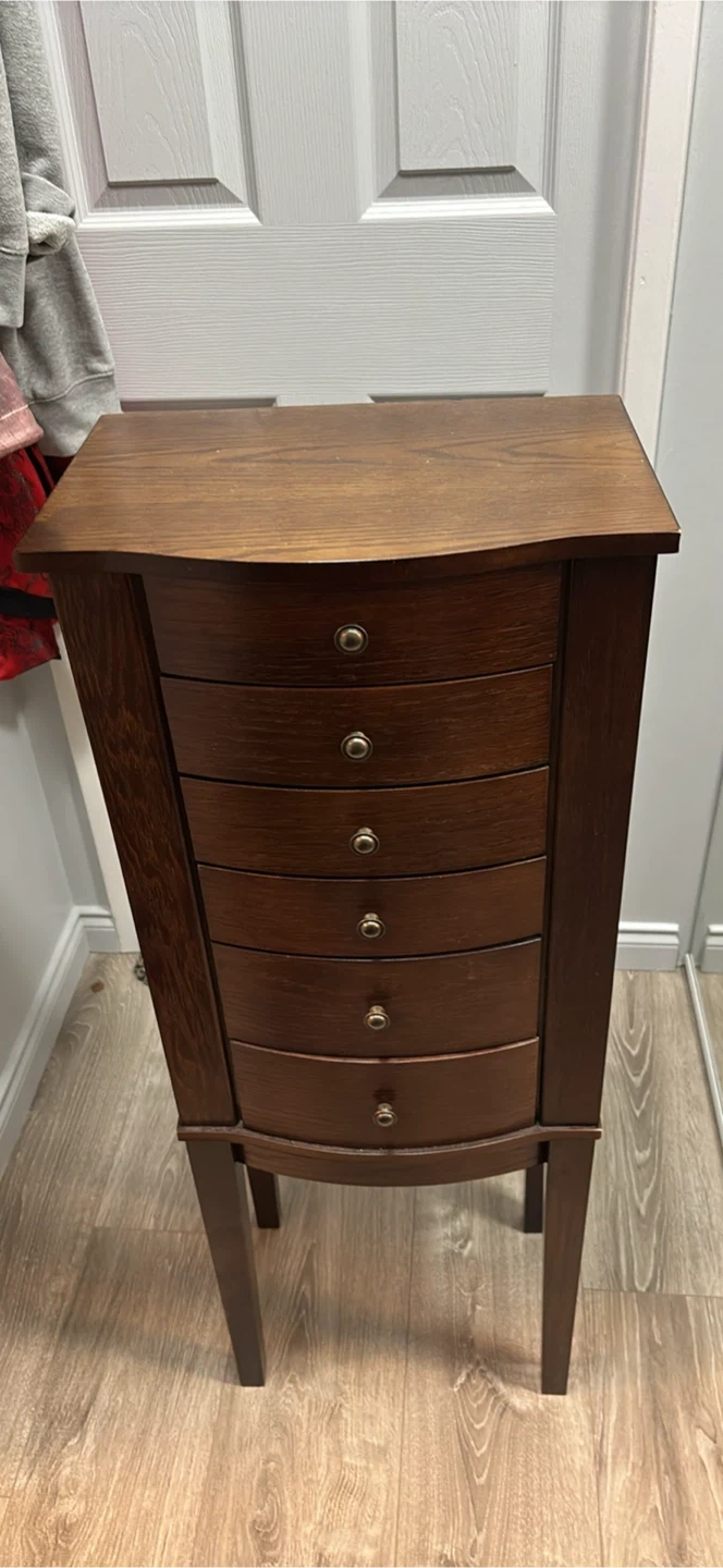 Selling a jewellery armoire in good condition. It has a dark brown wood finish and features several drawers and compartments for organizing your jewellery. There are also hooks inside the door for hanging necklaces and bracelets. It's a great piece to keep your valuables safe and organized