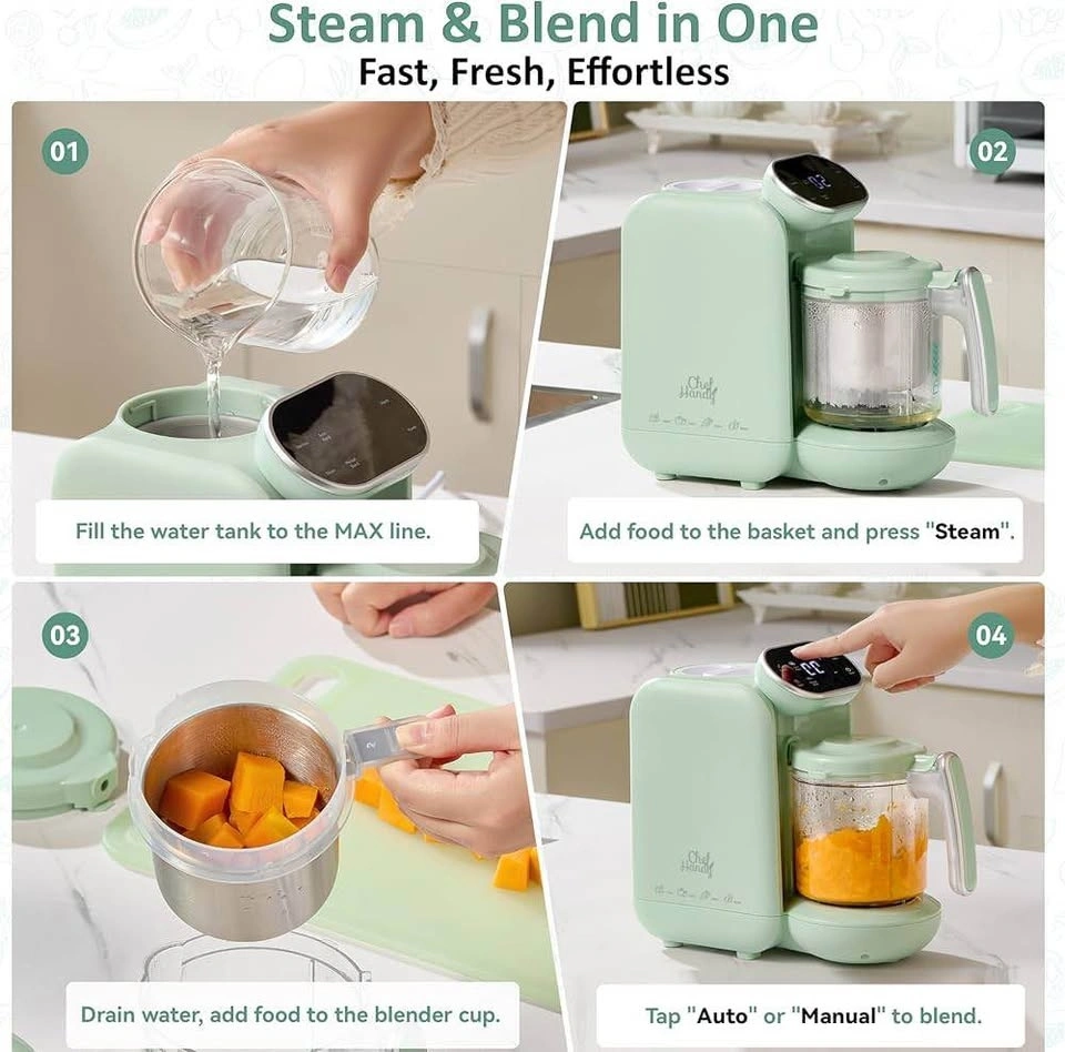 Baby Food Maker with Stainless Steel Steam Basket, One Step 5-in-1 Baby Food Processor Steamer Blender & Steam Cleaning, Auto Cooking, Puree & Baby Warmer with 6 Food Pouches, BPA-Free, Green