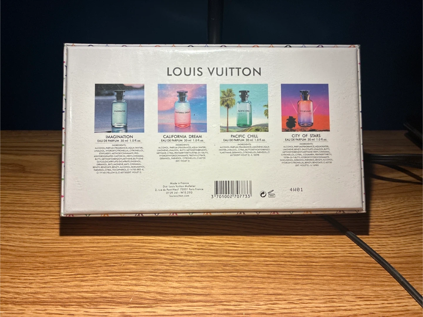 Selling a Louis Vuitton miniature perfume set. It includes four different scents: Imagination, California Dream, Pacific Chill, and City of Stars. Each bottle contains 30ml (1.0 fl oz) of Eau de Parfum. The set comes in its original box, perfect for gifting or personal use
