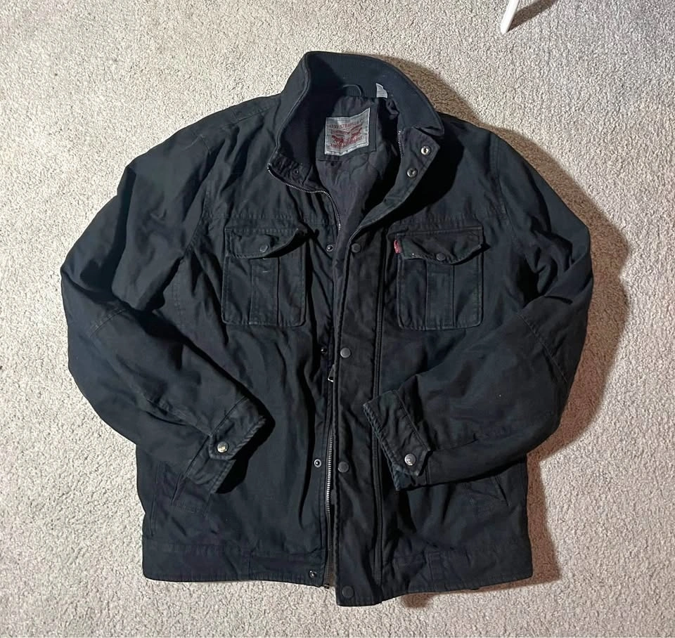 Black motorcycle jacket with two chest pockets and button cuffs. Has a zip and snap front closure. Lined with a dark fabric. Two side pockets with snap closures.