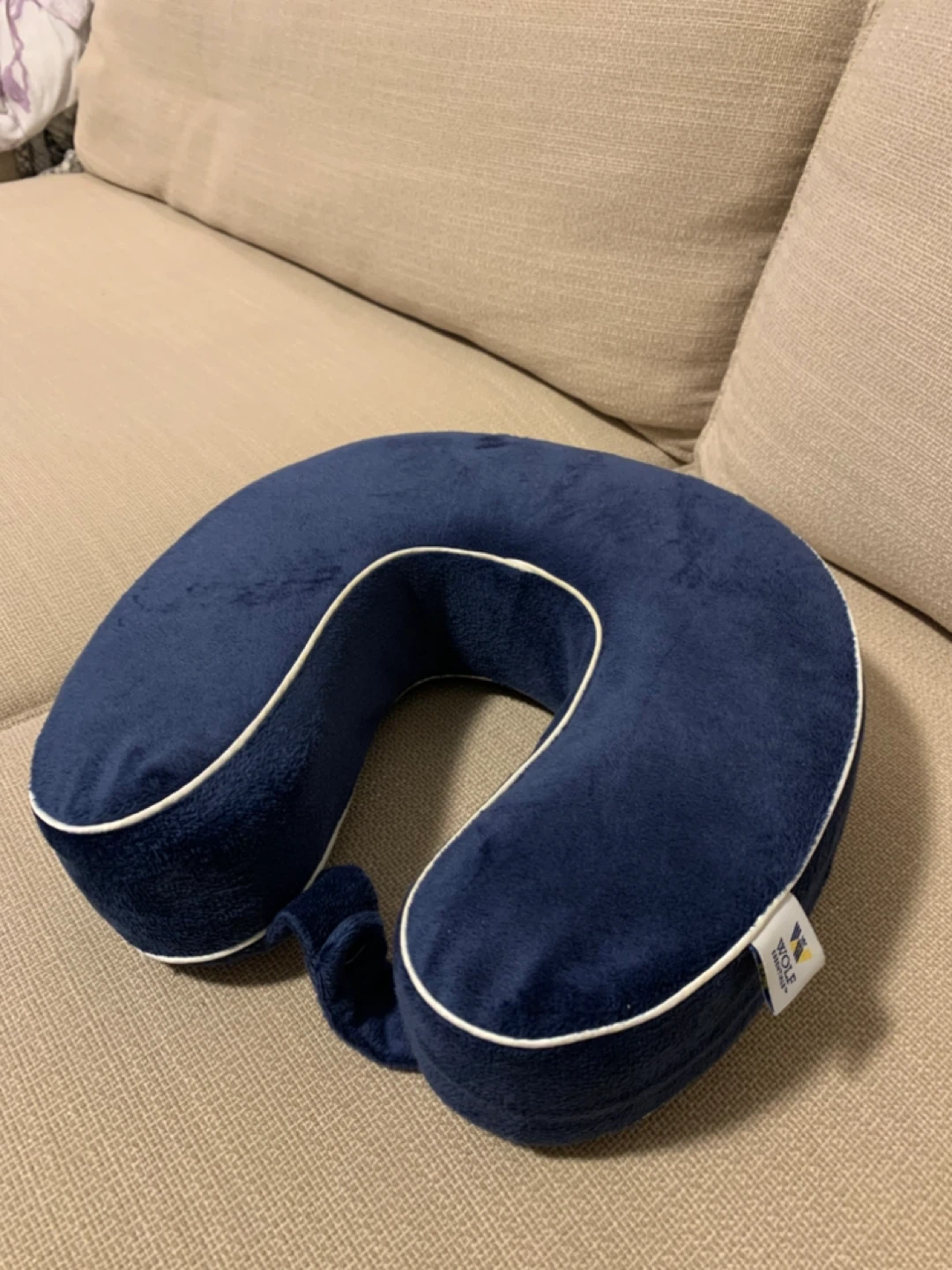 Here's a comfy navy blue Wolf memory foam travel pillow! It's in great condition and ready for your next trip. Perfect for long flights or car rides to keep your neck supported and help you relax.