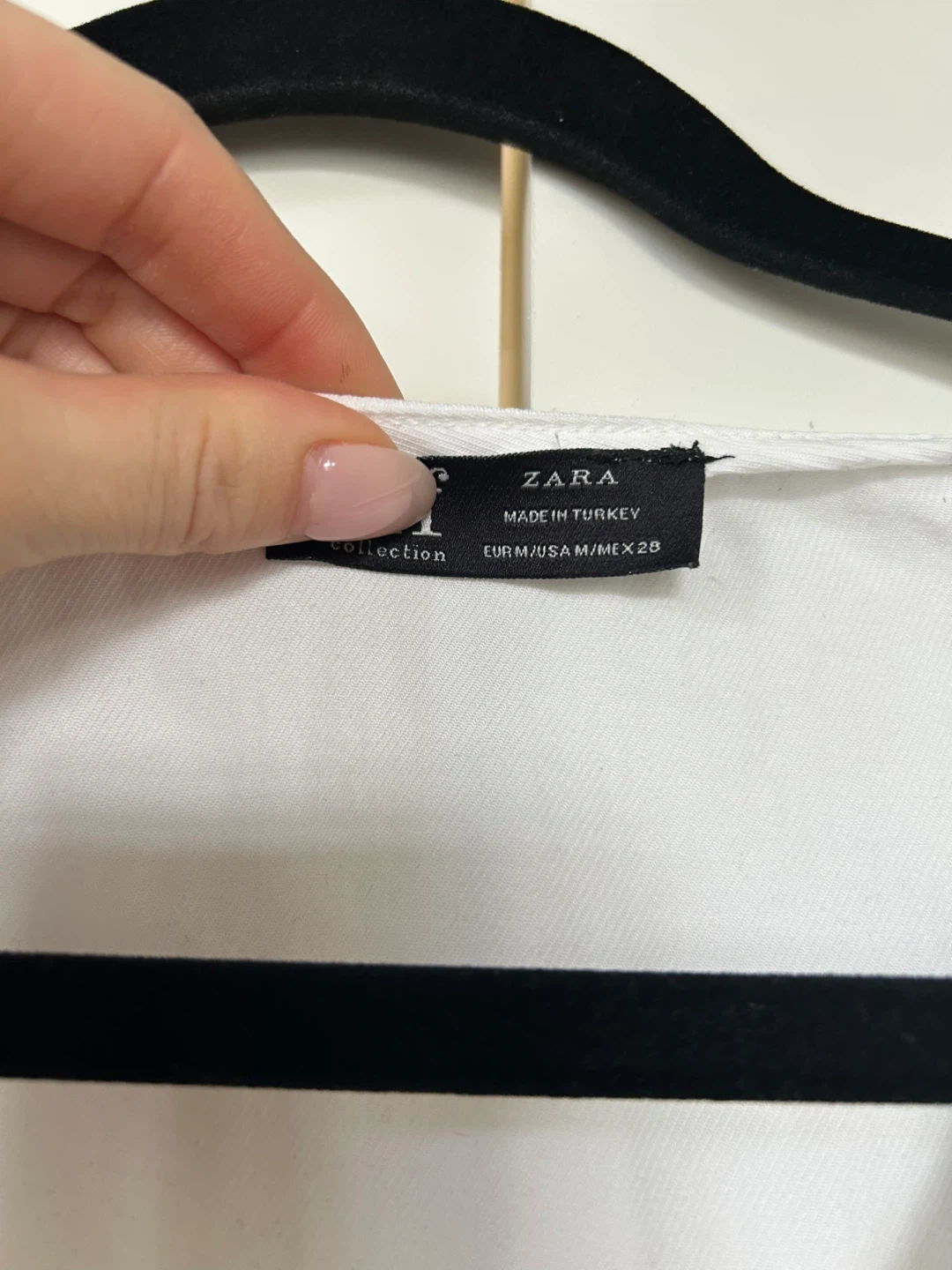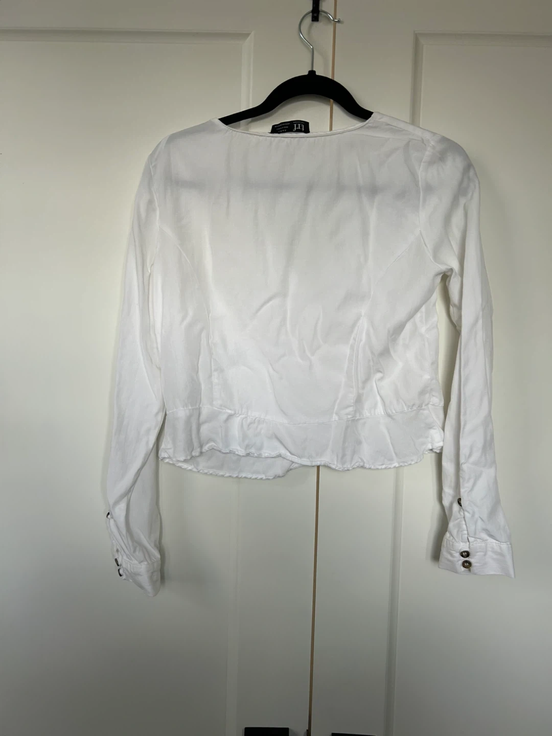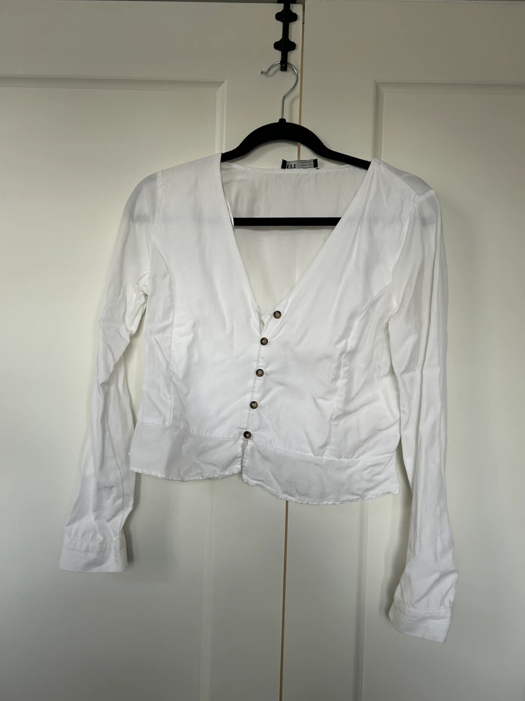 Selling a Zara white blouse in size medium. It's in great condition and ready for a new wardrobe! The material feels lightweight and comfortable, perfect for spring or summer. The blouse features long sleeves and button detailing