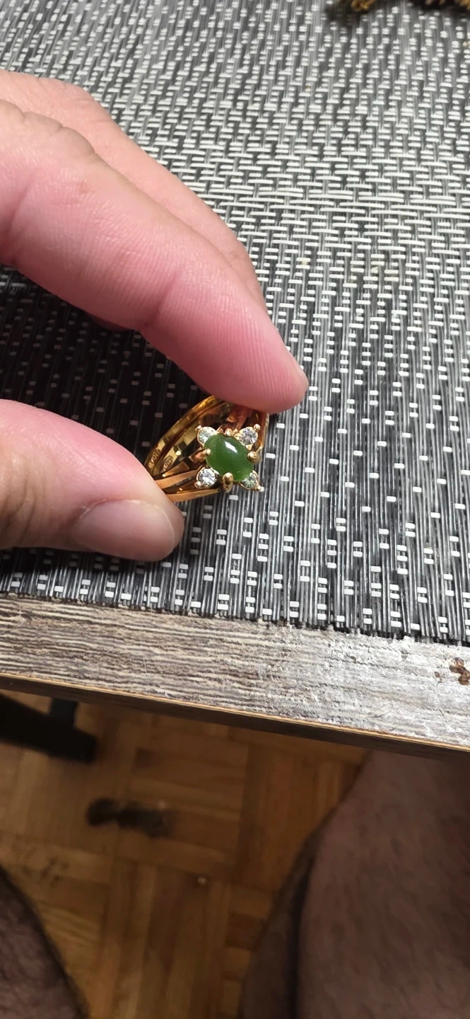 Selling a beautiful gold ring featuring a green stone surrounded by diamonds. It's in great condition and ready to add a touch of elegance to your style