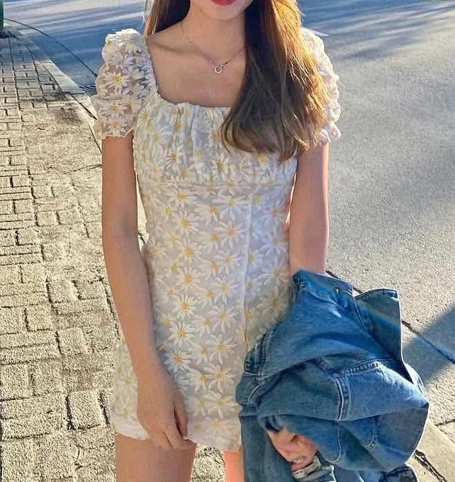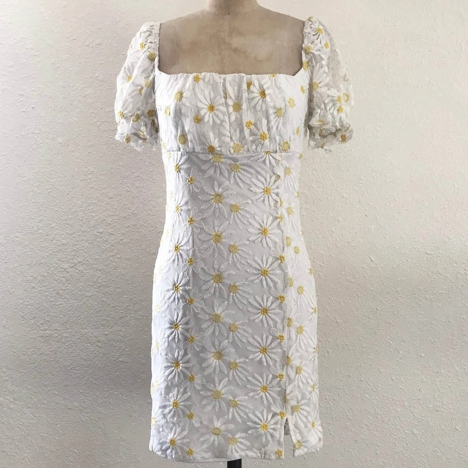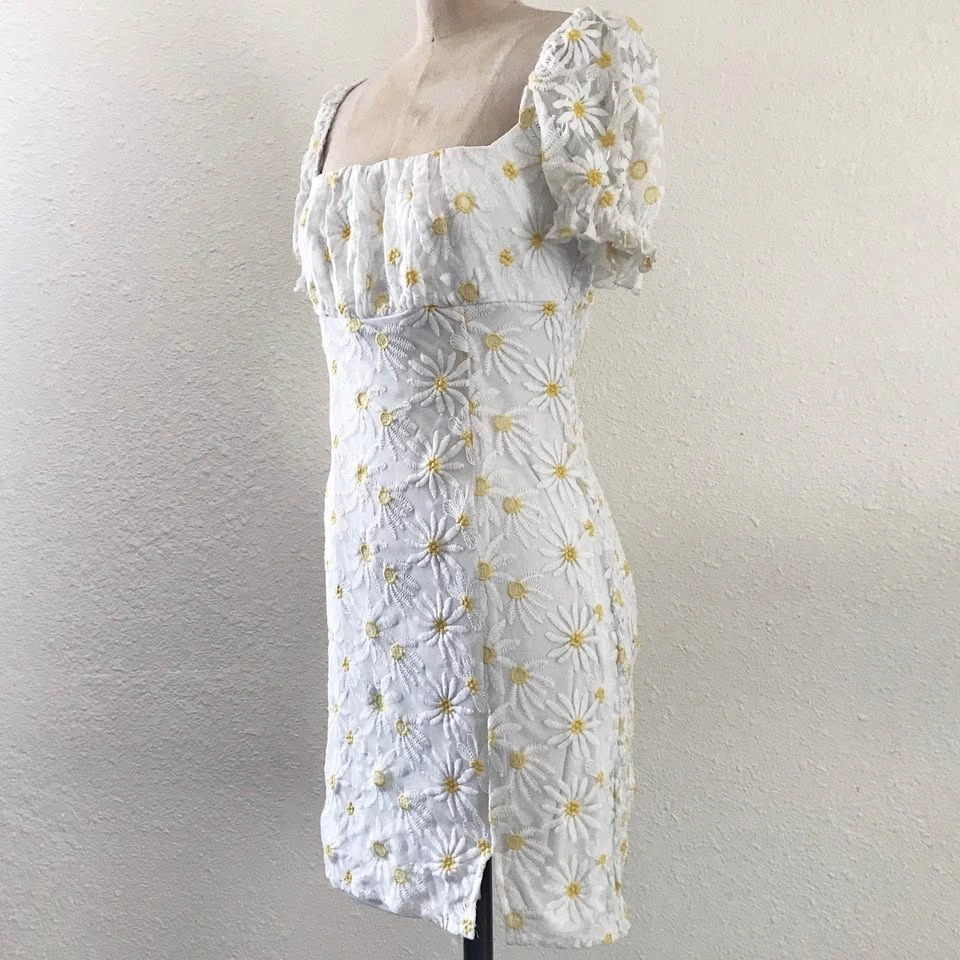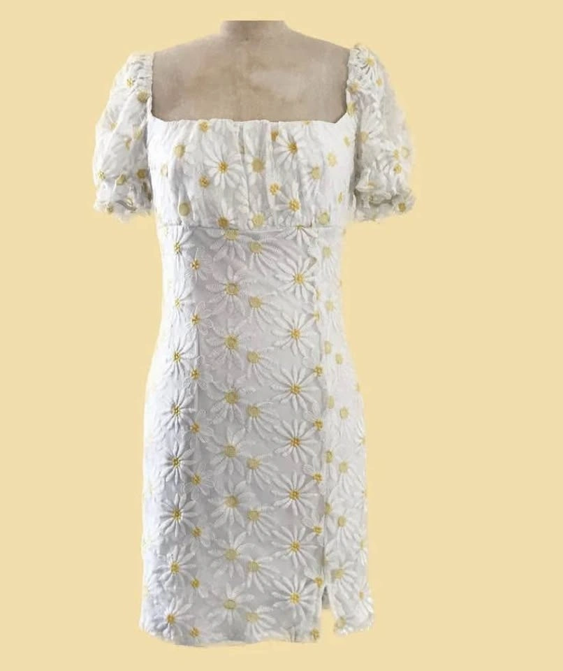 Adorn yourself in floral elegance with this daisy-embroidered mini dress. Featuring puff sleeves and a square neckline, it’s perfect for exuding charm and femininity on sunny days or casual outings.