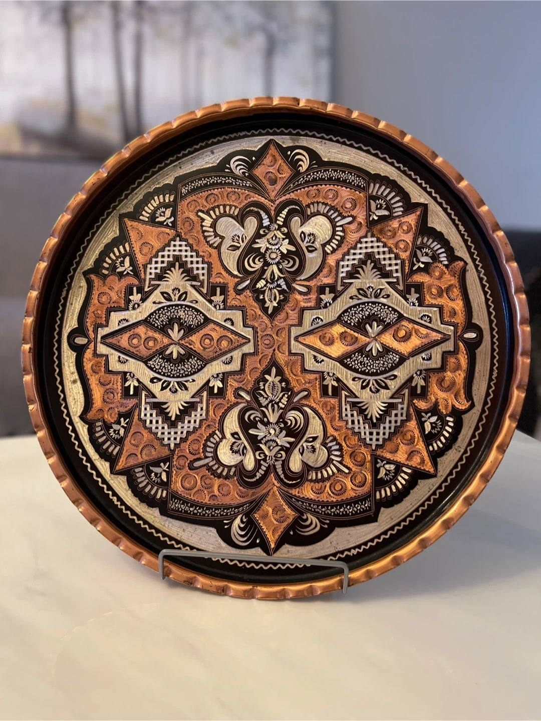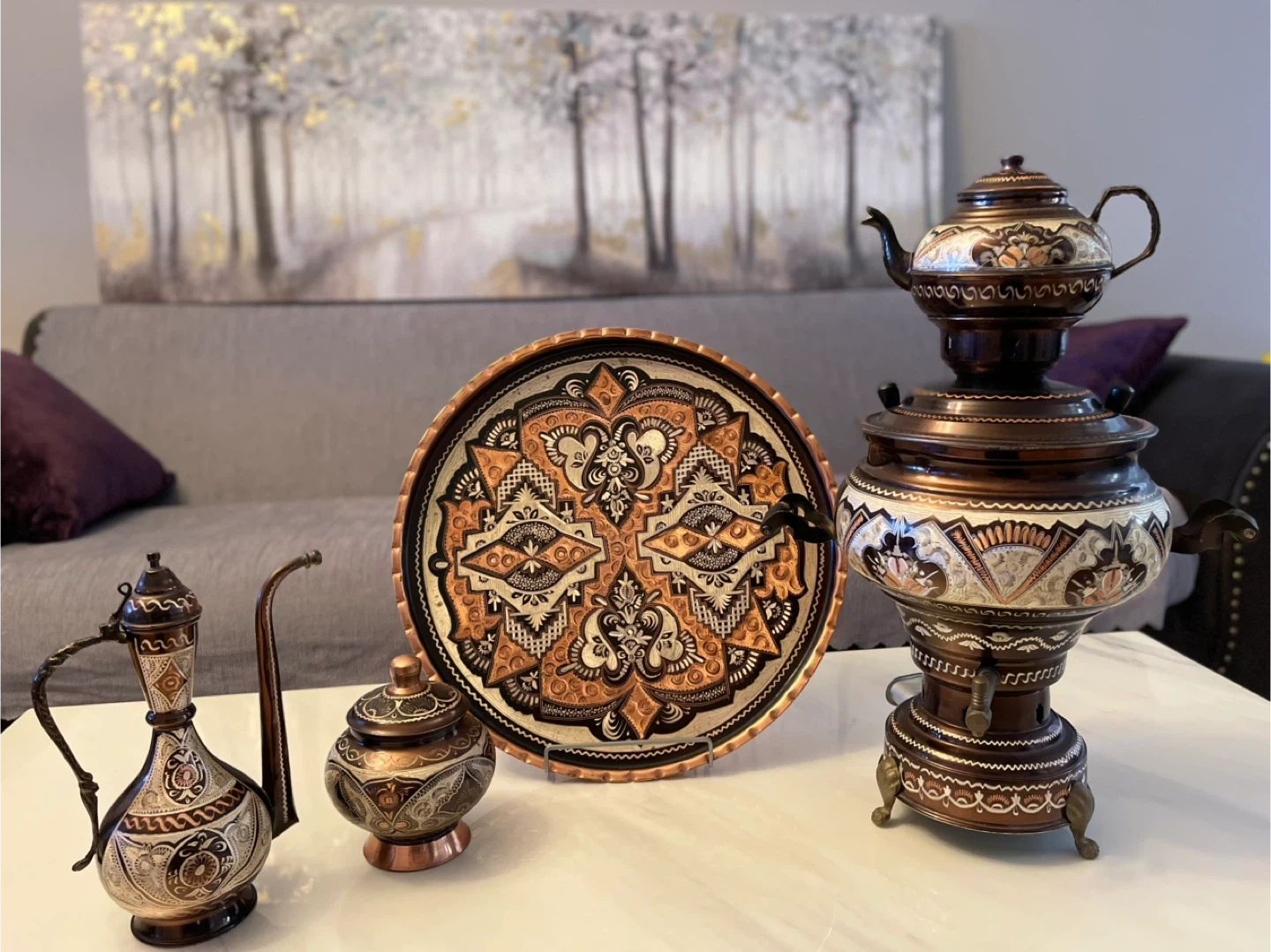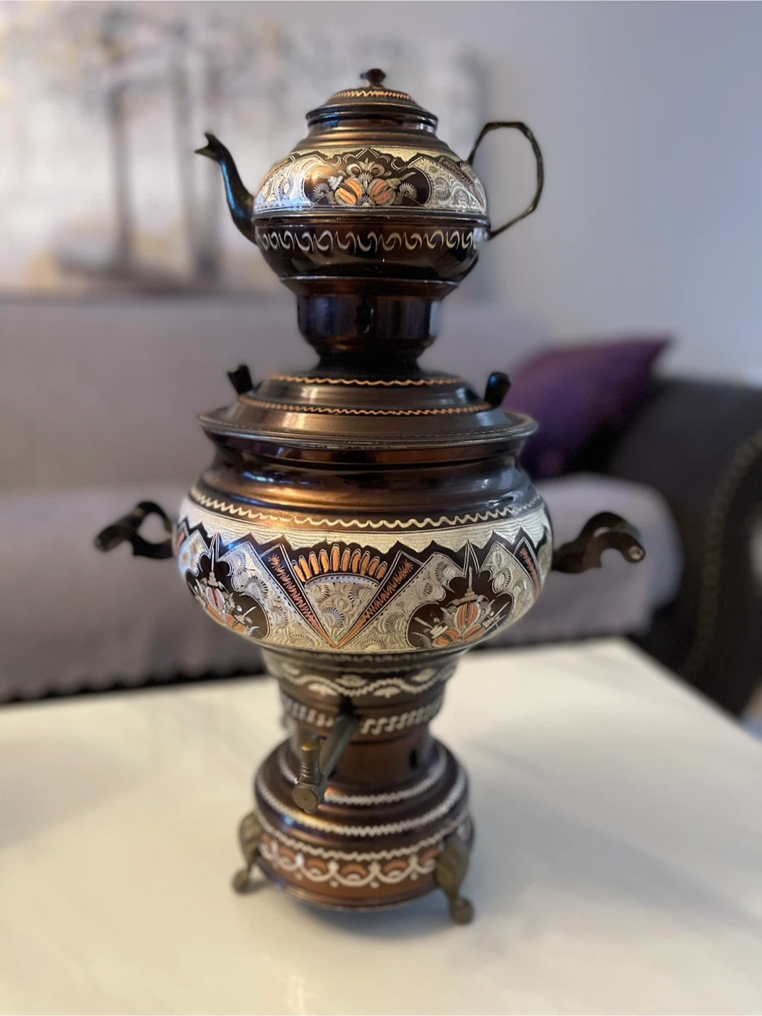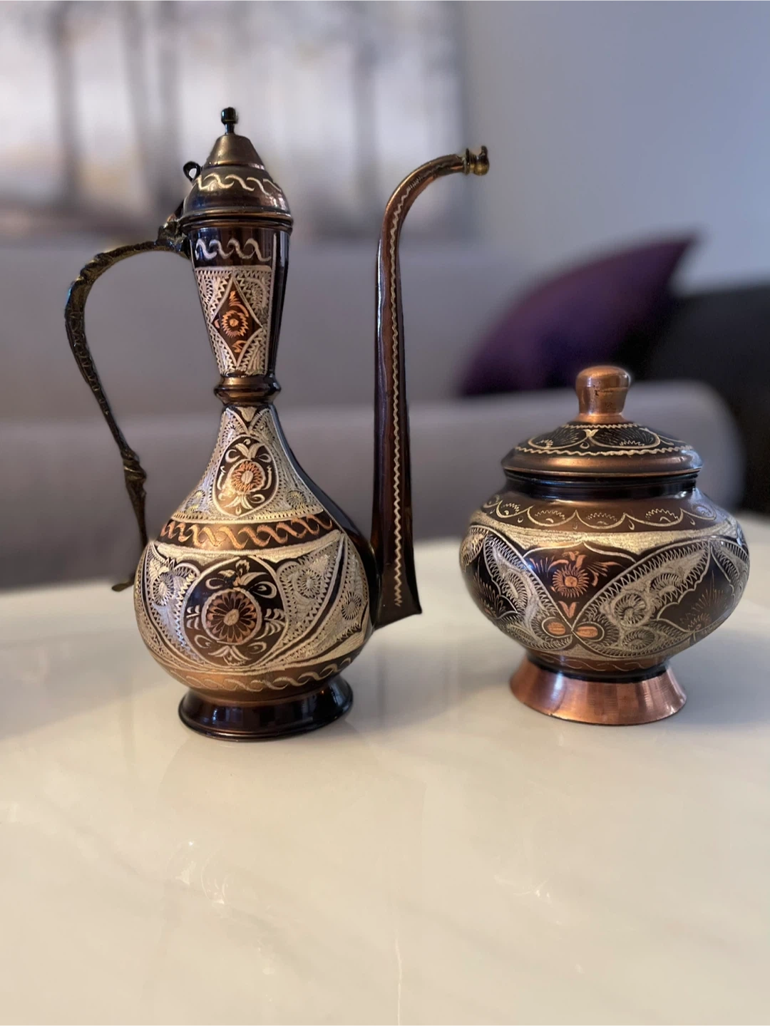 Selling a beautiful vintage copper tea set. The set includes a samovar, a pitcher, a sugar bowl, and a decorative tray. The intricate designs and patterns add a touch of elegance to any home. Perfect for tea lovers or as a unique decorative piece!