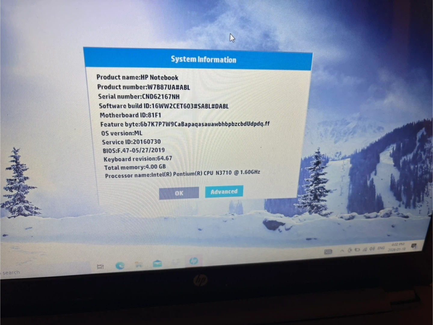 Selling an HP Notebook in used condition. It has 4GB of RAM and a processor Intel(R) Pentium(R) CPU N3710 @ 1.60GHz. The product number is W7B87UA#