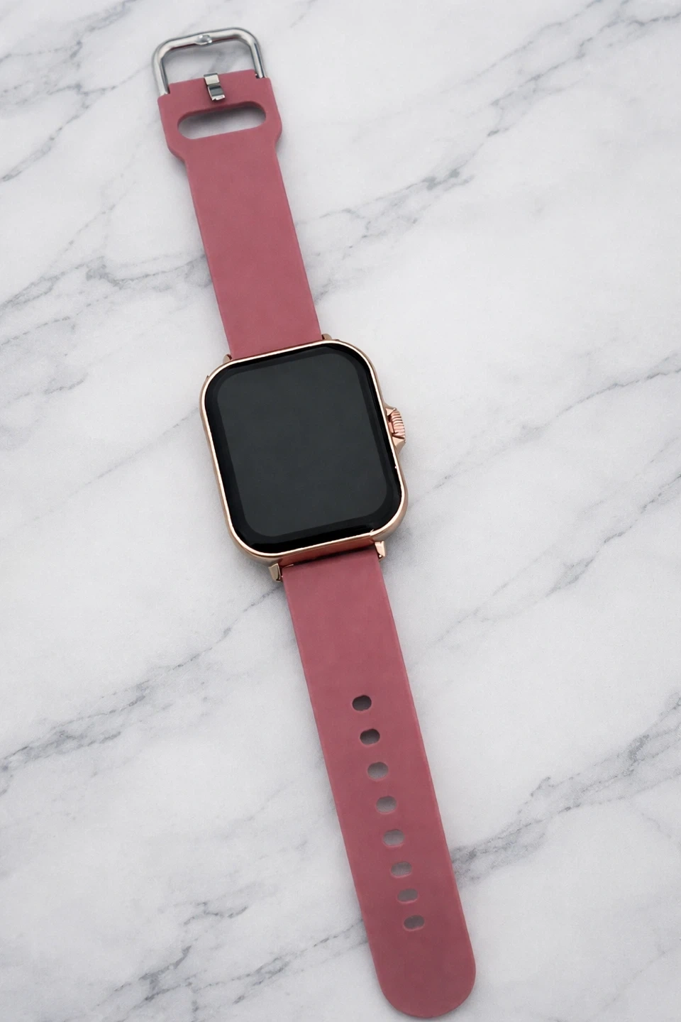 Selling a smart watch with a pink band and rose gold casing. It's in great condition and ready for a new wrist!