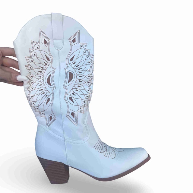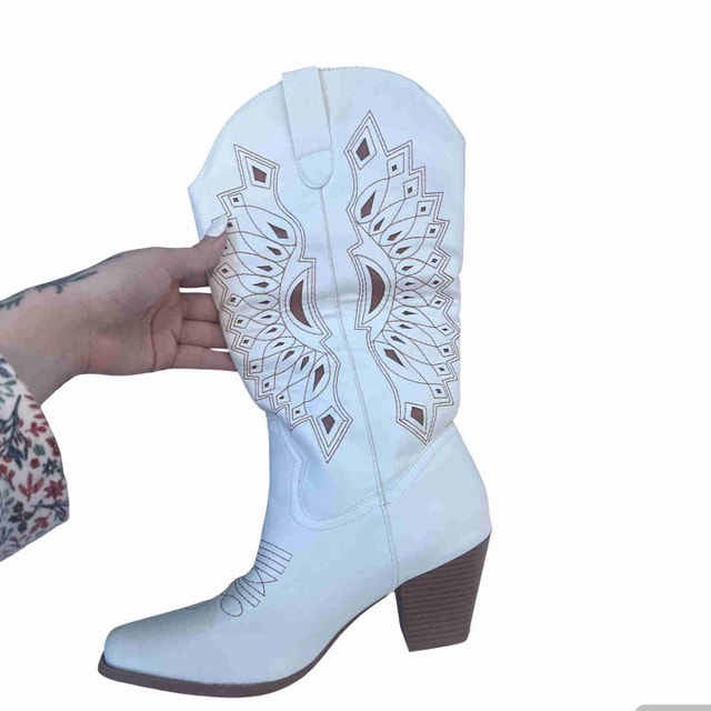 Chic white cowboy boots from SHEIN with beautiful stitched detailing. These boots are brand new, never worn, with the original stuffing still inside. Super good quality and perfect for outfits year-round — festivals, brunch, or elevating a casual look.
