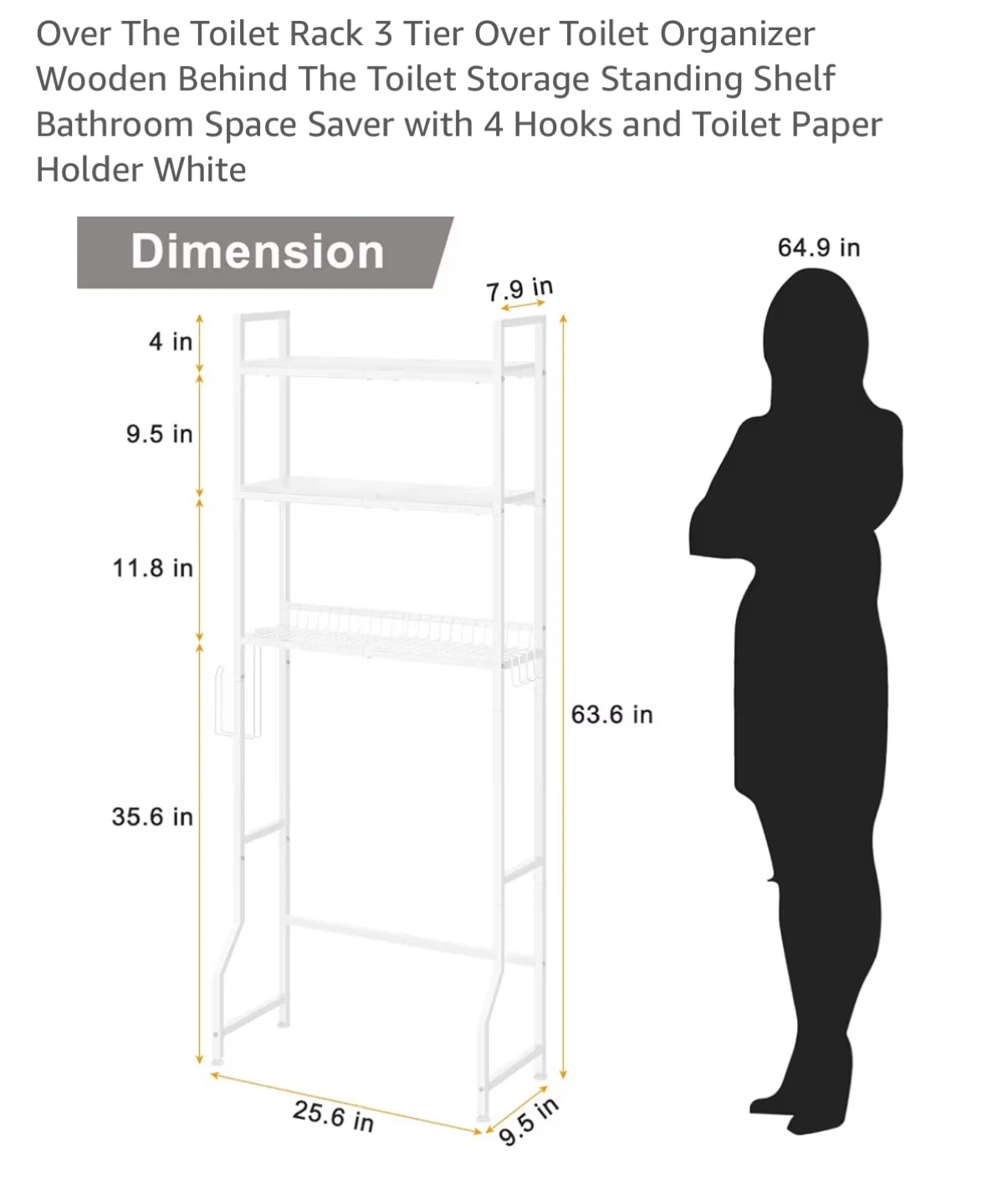 Declutter your bathroom with this 3-tier over-the-toilet rack! It's a great space saver with a wooden design and a white finish. It also comes with 4 hooks and a toilet paper holder. Dimensions are approximately 7.9 inches deep, 25.6 inches wide, and 64.9 inches high