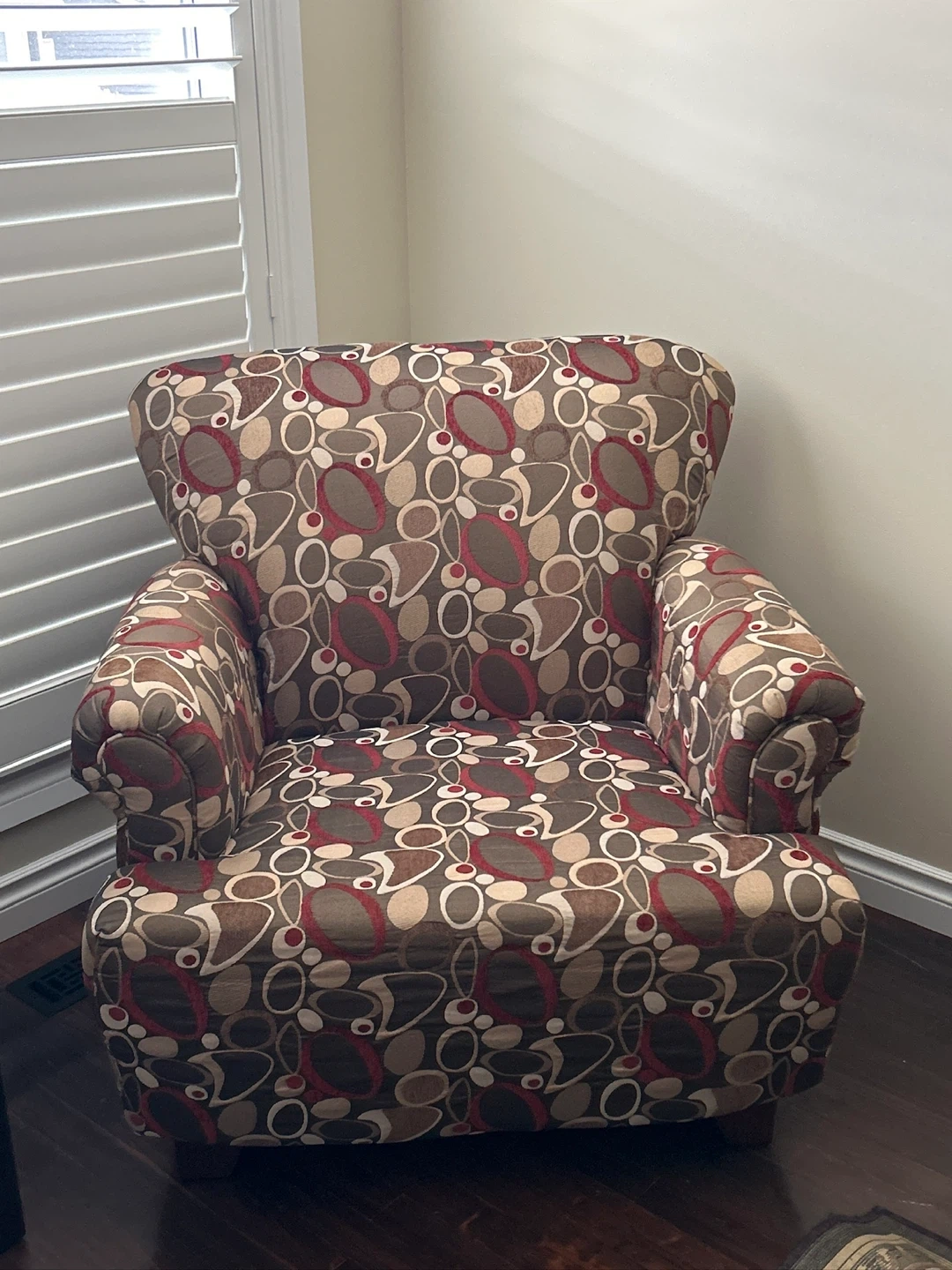 This is a patterned accent chair that would look great in any room! It has a unique design with brown, red, and beige tones. It's in good condition and ready for a new home