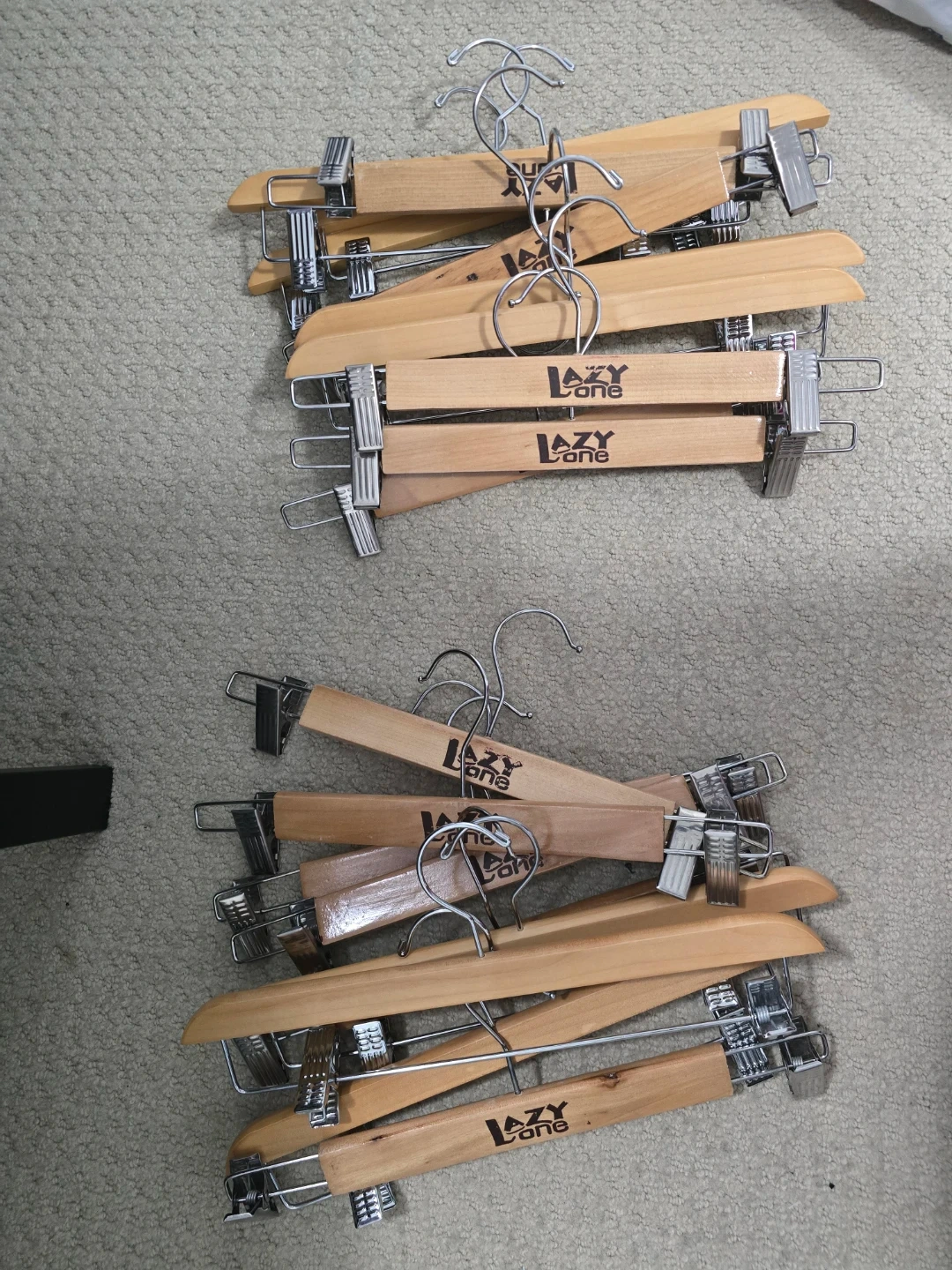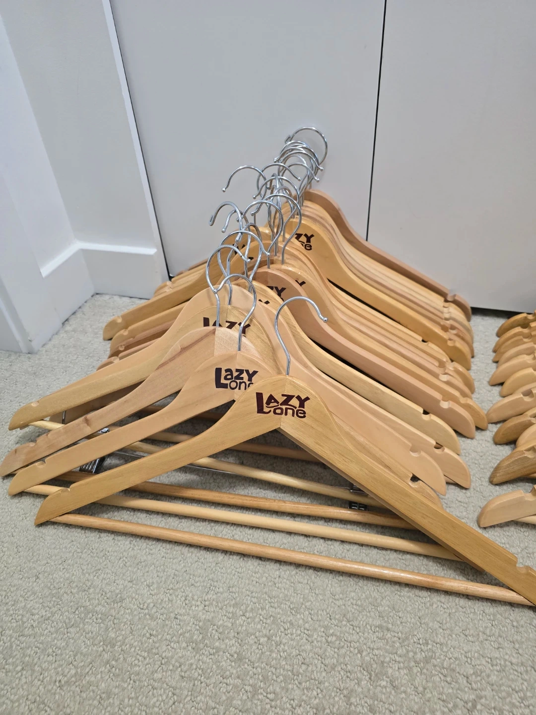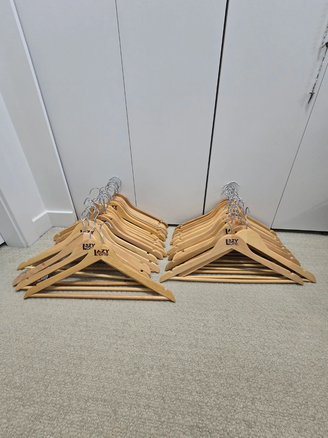 Selling a lot of 30 wooden hangers and 19 wooden pant hangers. They're in great shape and ready to keep your clothes organized. Perfect for any closet, these hangers are sturdy and stylish.