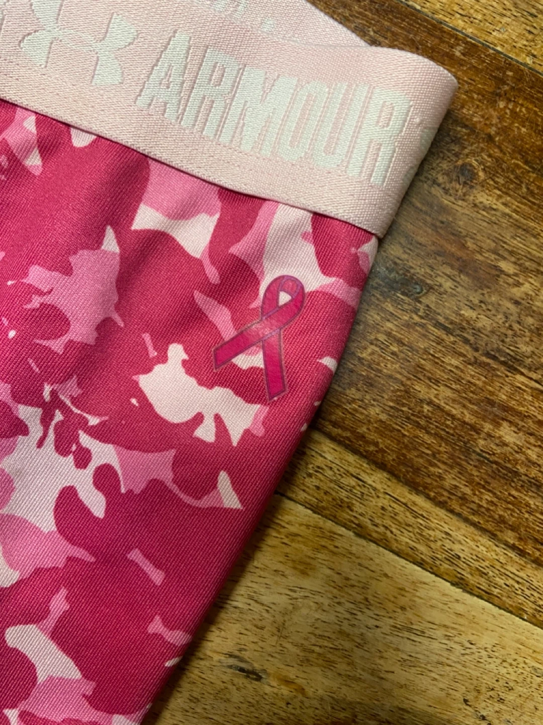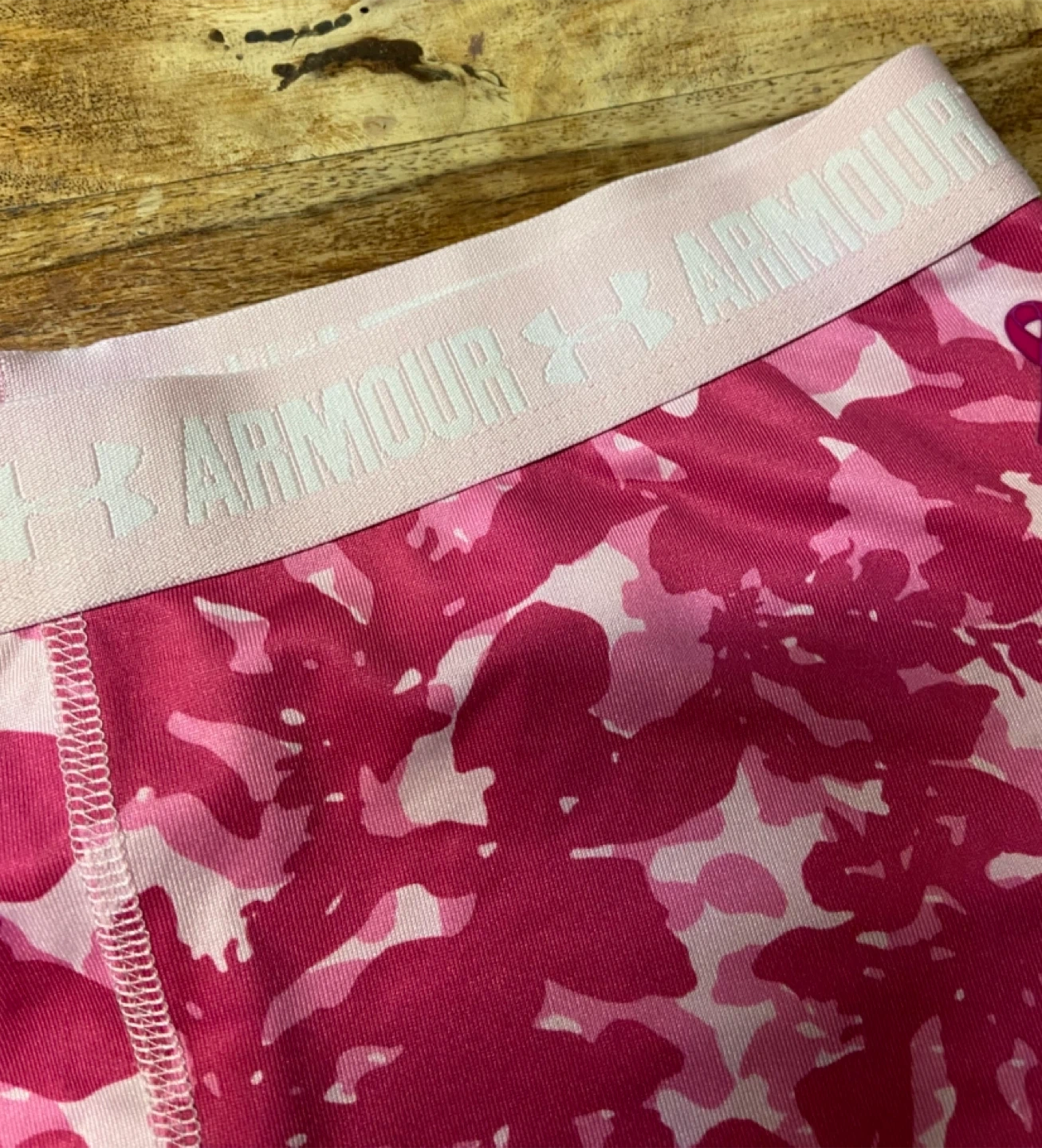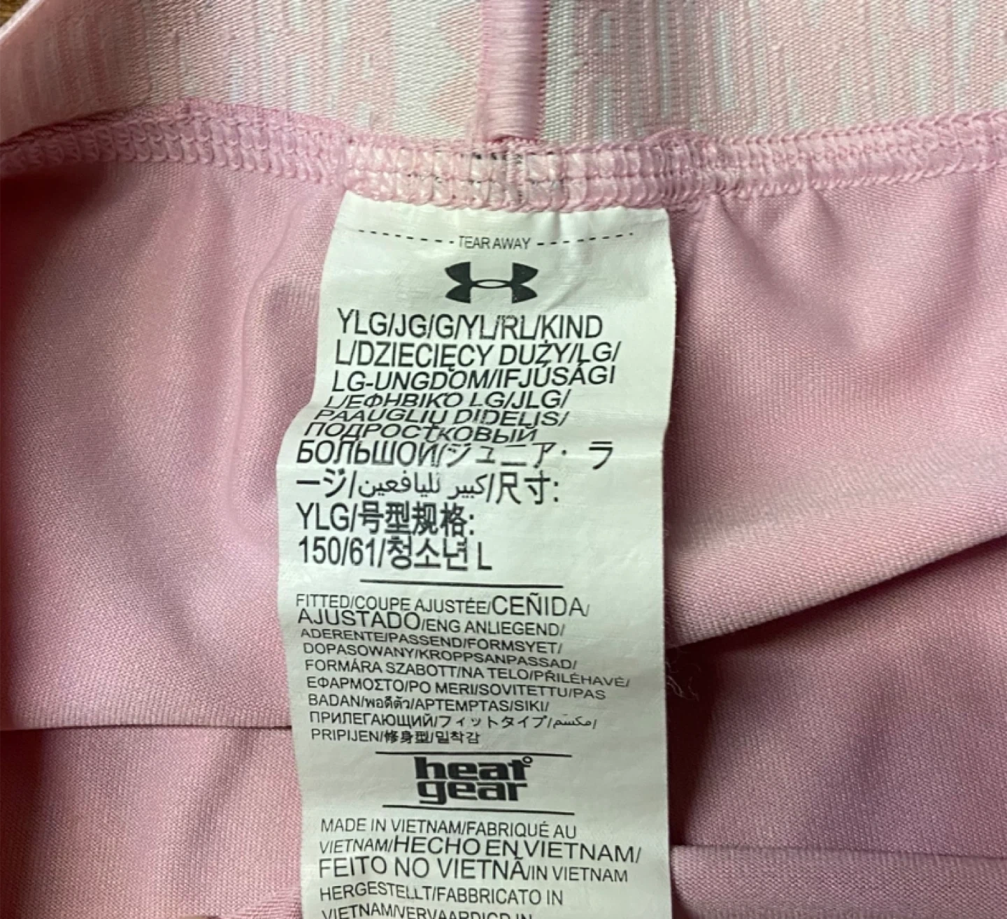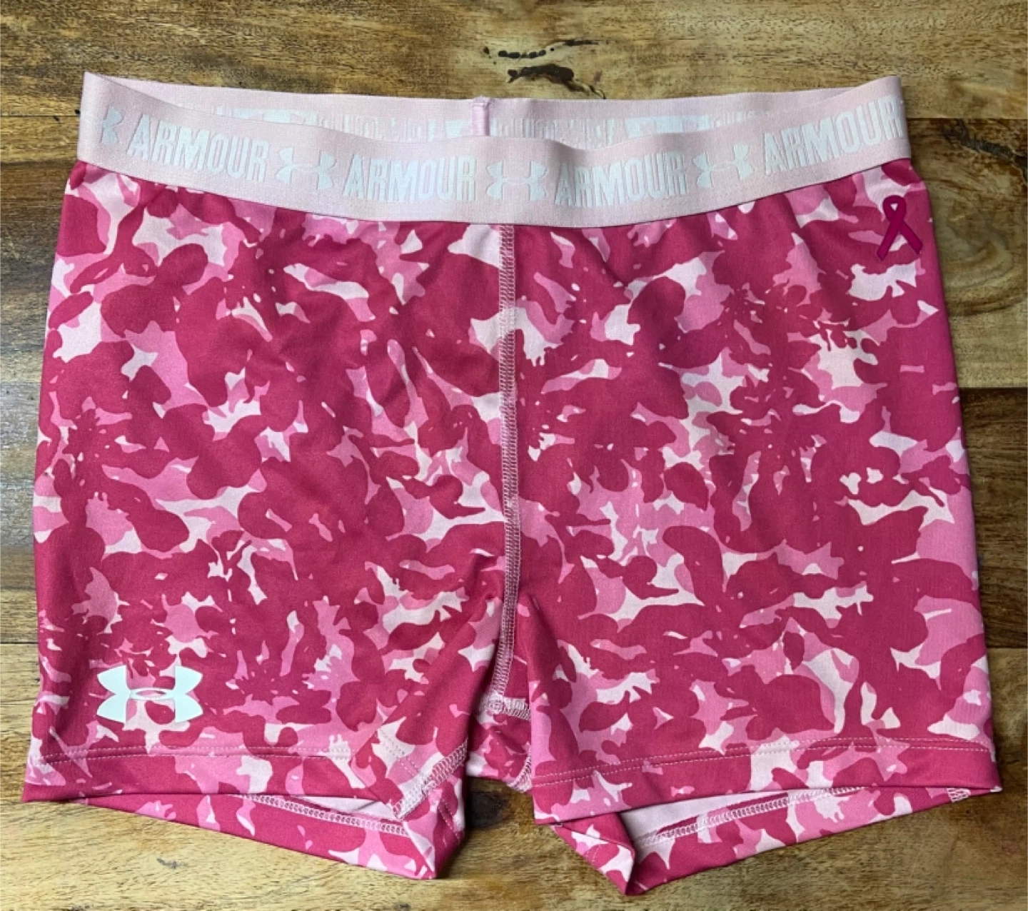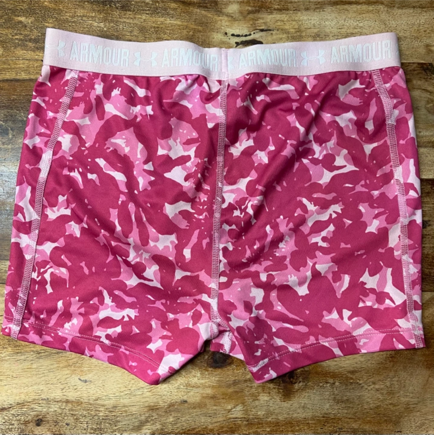 Selling a pair of Under Armour HeatGear shorts for girls in size YLG (Youth Large). They feature a pink camouflage pattern and the Under Armour logo on the waistband and leg. These shorts are designed to keep you cool and comfortable during workouts or everyday activities