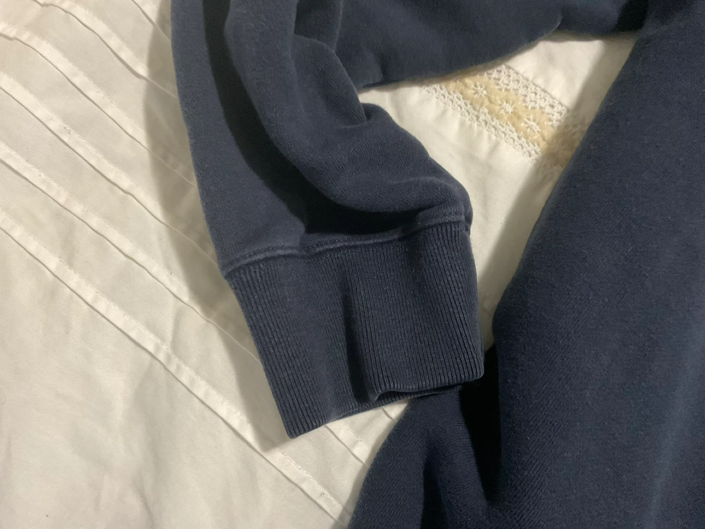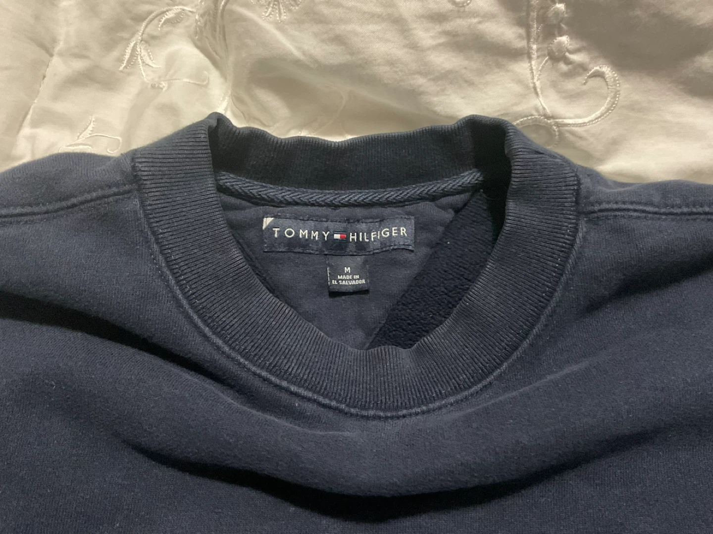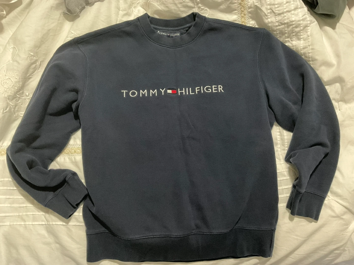 Selling a Tommy Hilfiger crewneck sweater in navy blue. It's a size medium and made of comfortable material. Perfect for layering or wearing on its own!