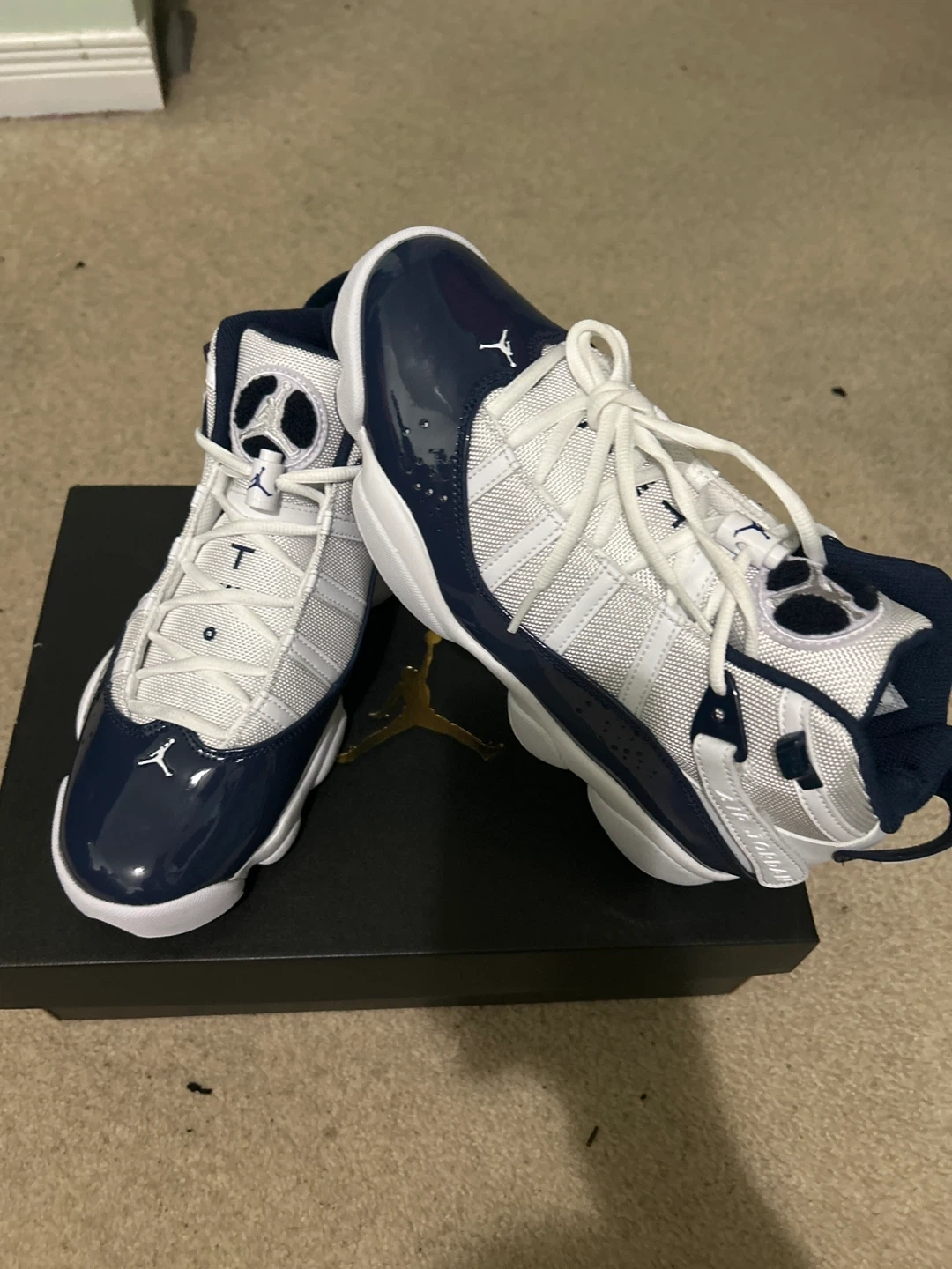Selling a pair of Jordan 6 Rings in a stylish navy and white colourway! They are in US size 9.5. The shoes come with the original box