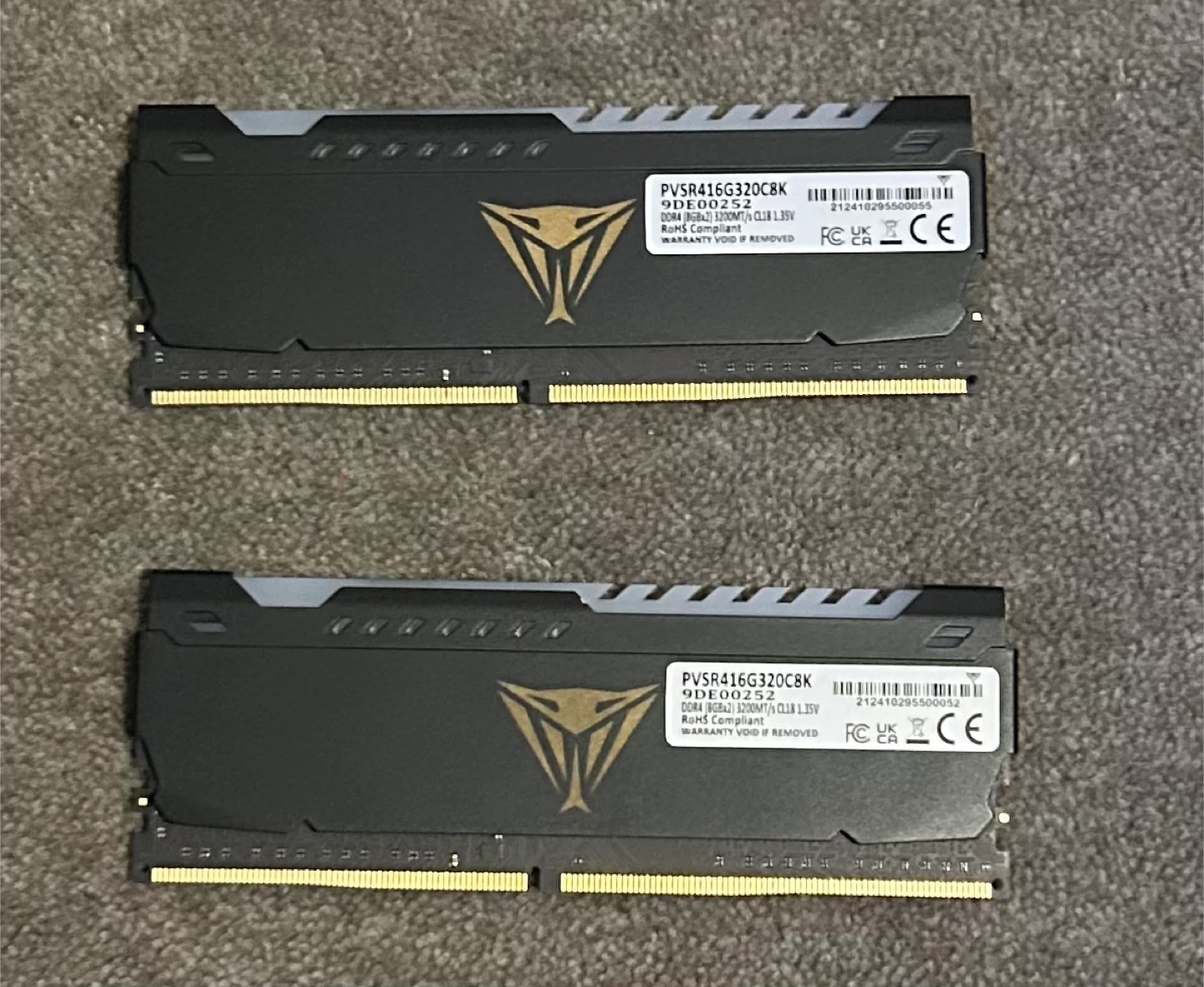 Selling a pair of Patriot Viper Steel DDR4 RAM sticks. Each stick is 8GB, for a total of 16GB. They run at 3200MHz with CL18 timing. Great for upgrading your PC's memory!