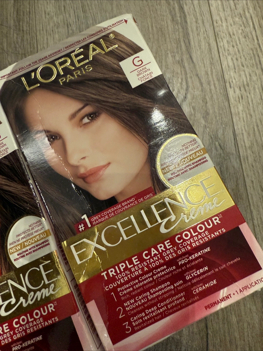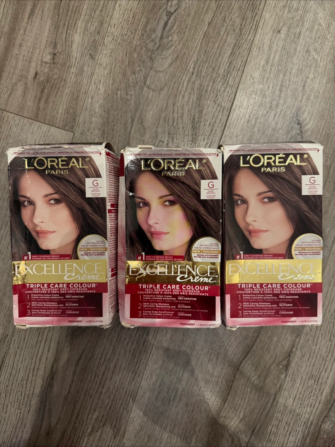 Selling L'Oréal Paris Excellence Crème hair colour in Dark Brown. This is a triple care colour that offers 100% grey coverage. Boxes are crushed from moving, all 3 boxes brand new, never opened. $10 pick up by the Eaton Center at my condo