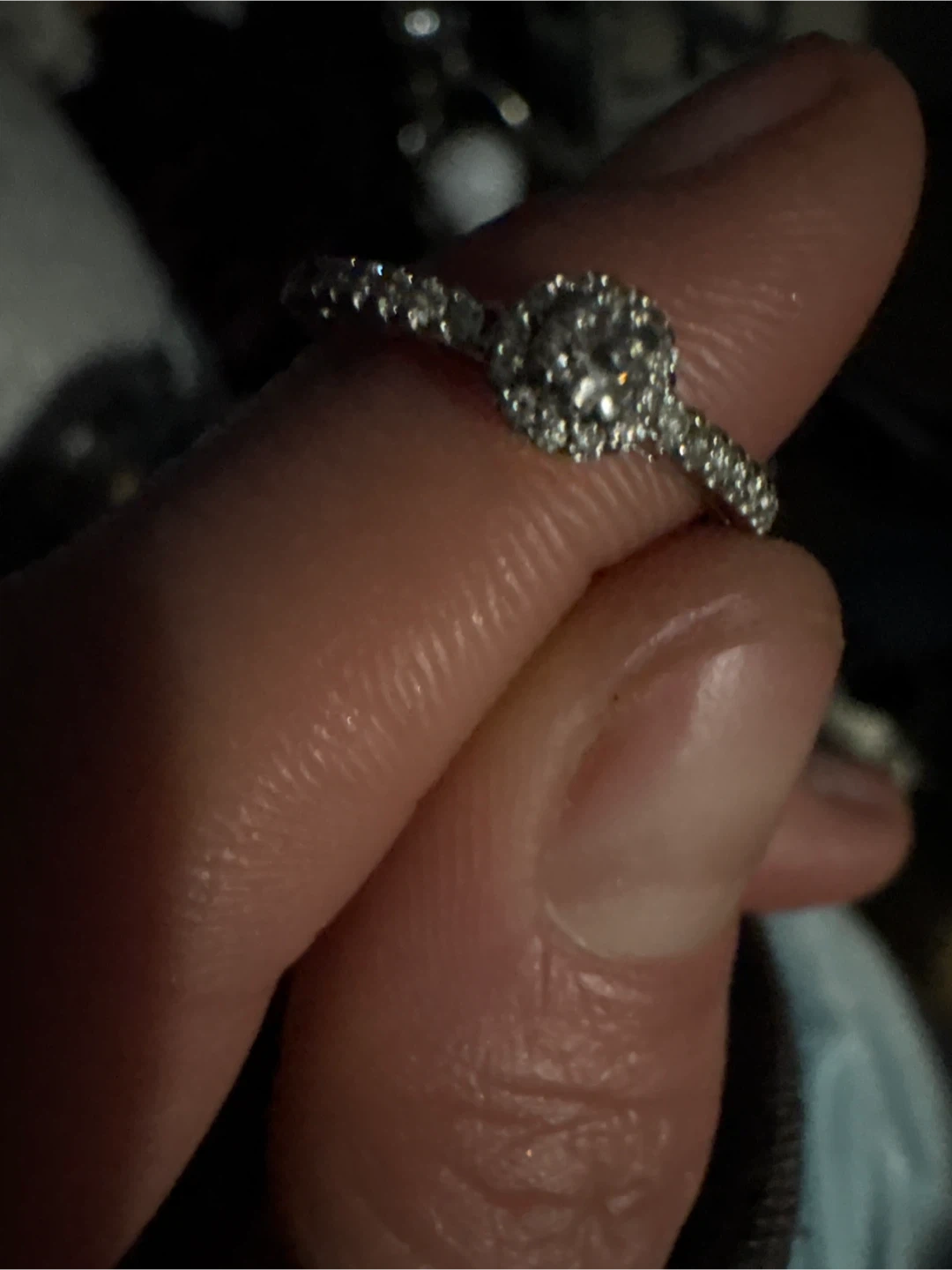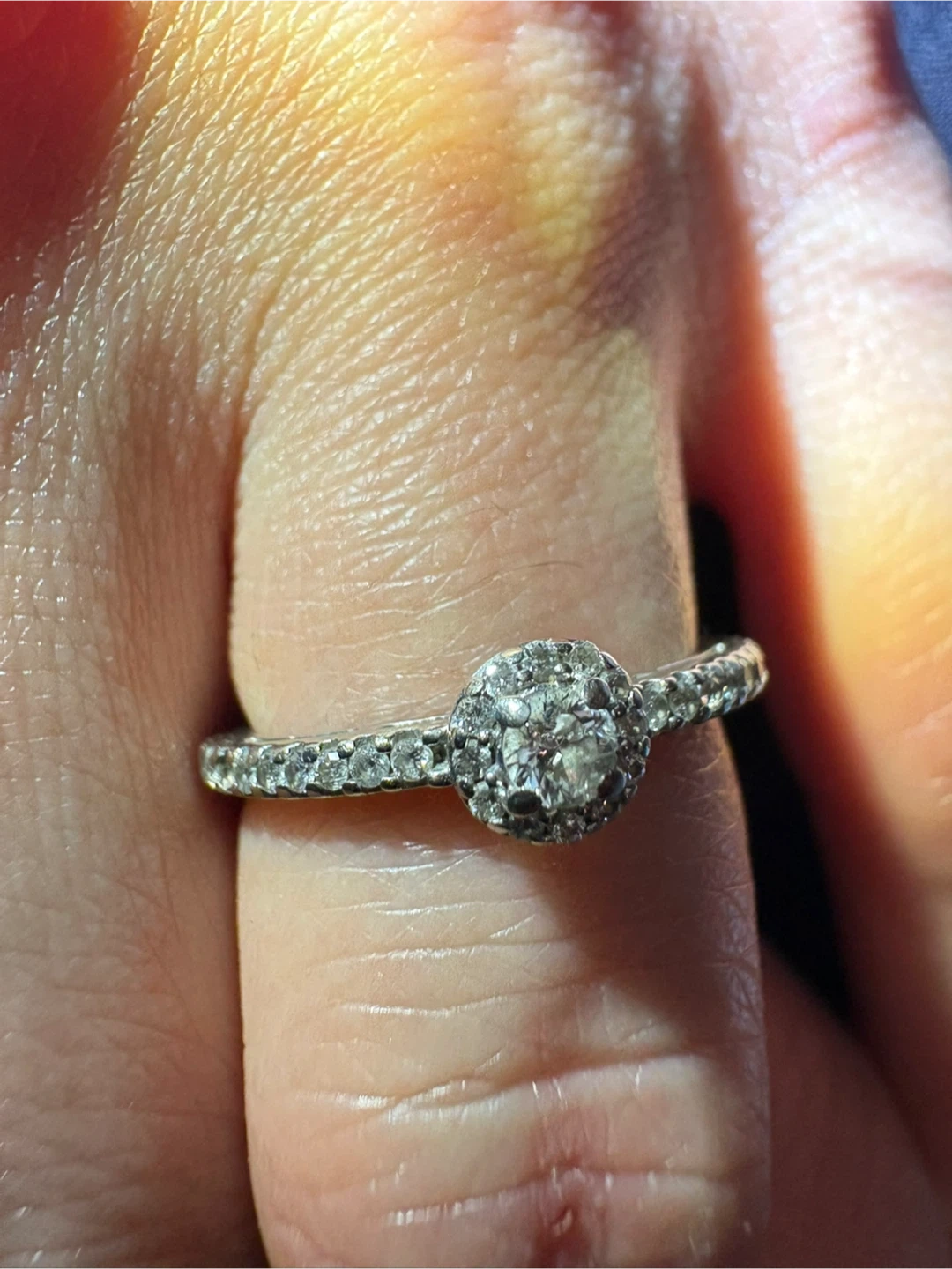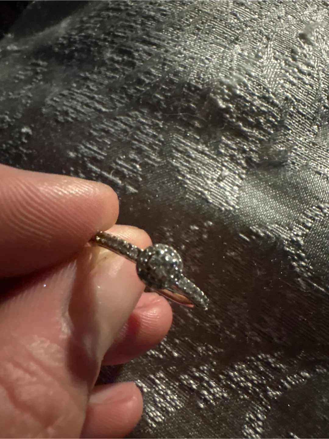 Selling a beautiful diamond ring. It features a central diamond surrounded by smaller diamonds on the band. It's in great condition and would make a lovely addition to anyone's jewelry collection