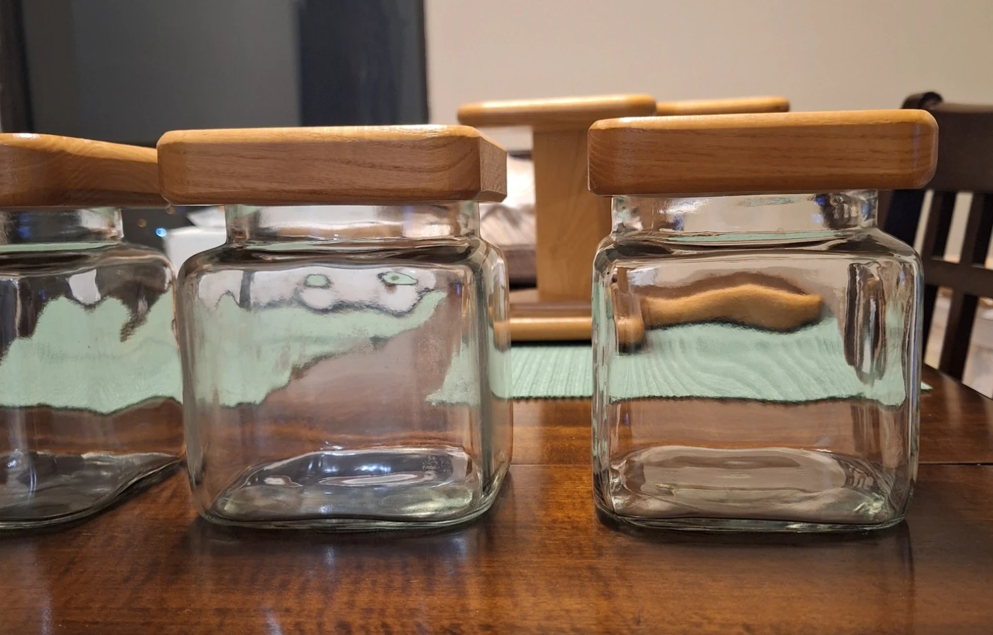 5 piece Canister Set. Includes 4 glass Canisters with wooden tops and a wooden stand. Each Canisters holds approximately 4 cups/32oz.