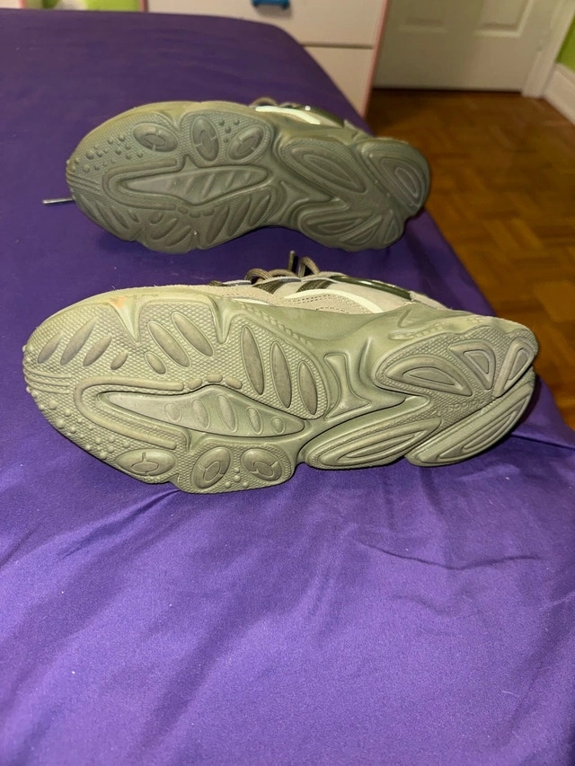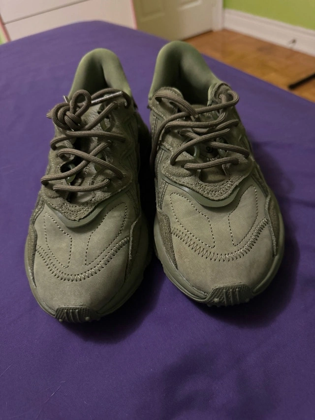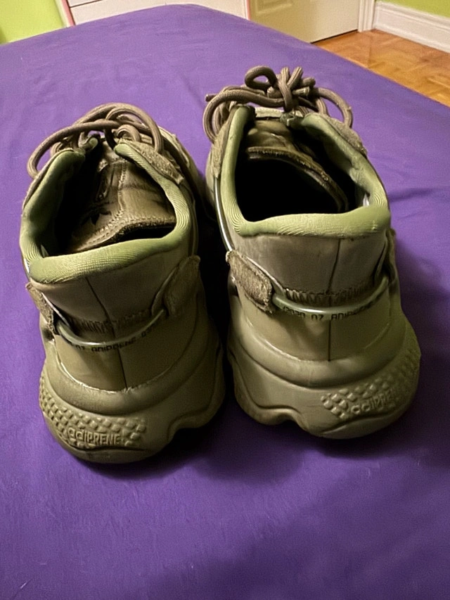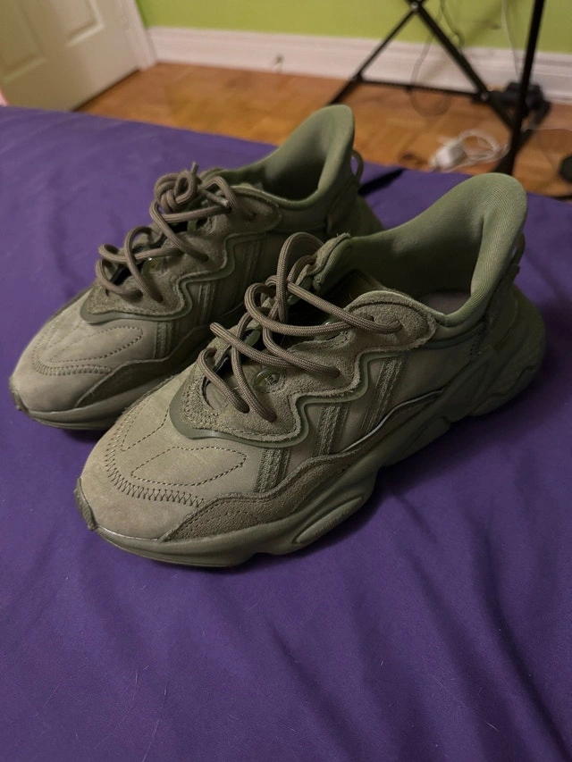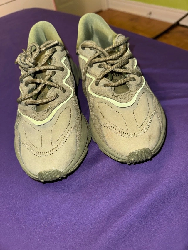 Like New condition, the price tag is still inside the shoe. It was $160 before taxes, so basically $180 retail price. My fiancé bought it but they don’t fit her feet unfortunately. Size 6 Women’s / Size 5 Men’s Doesn’t come with box but shoes are otherwise new. Comfortable khaki green shoes. Ideal for everyday use. Step out in style with these gently Adidas Ozweego shoes in a unique olive green colour. These shoes are a US women's size 6, or a US men's size 5. Although they've been worn with care, they still have plenty of life left in them! While I don't have a detailed list of specs, these shoes are known for their comfort and distinctive design.