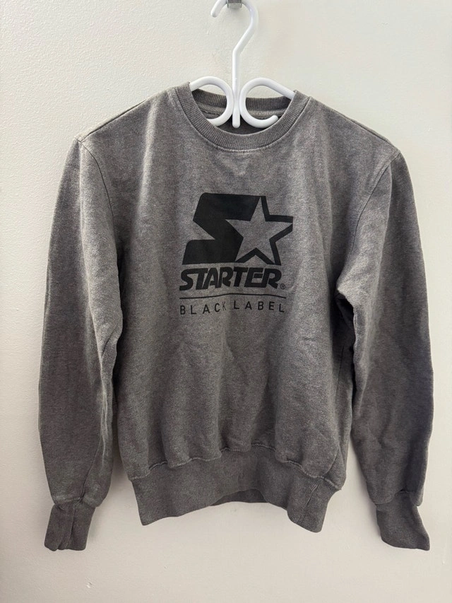Elevate your casual wardrobe with this Starter Black Label men's sweater, size small. This stylish grey sweater features the iconic Starter logo, perfect for a retro look. While it's a used item, it's still in good condition. It's a cozy and versatile piece that pairs well with jeans or joggers for a relaxed, sporty vibe.