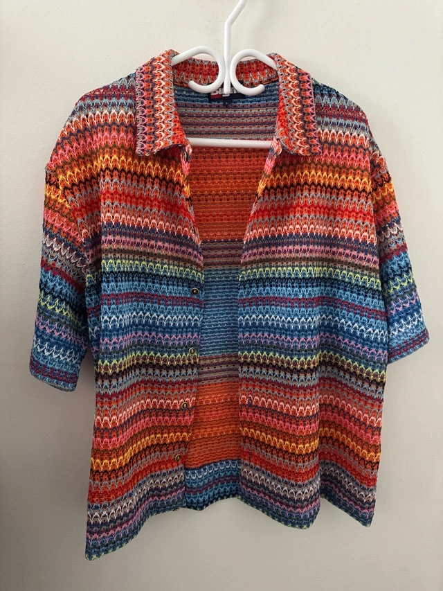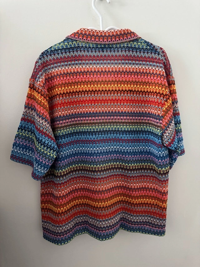 Add a splash of colour to your wardrobe with this eye-catching men's knitted cardigan, size large, featuring a vibrant array of colours. This unique piece is perfect for adding a bohemian touch to any outfit. The cardigan is in good used condition, showing only minimal signs of wear, ensuring it remains a stylish and comfortable choice for everyday wear. Size L, great for summers or any season other than winter.