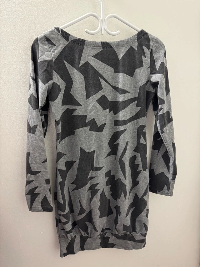 Add a bold touch to your wardrobe with this eye-catching grey and black geometric tee in women's size small. This stylish tee features a unique, all-over geometric print, long sleeves, and a comfortable fit. It's a fun and fashionable piece that’s perfect for casual outings or layering. The item is in good used condition.