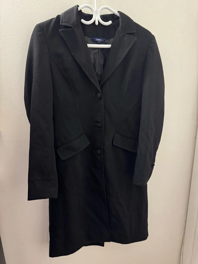This is a stylish black Reitman's trench coat in US size 3, perfect for adding a touch of elegance to any outfit. While it is a used item, it's in good condition. It features a classic design with a button-up front and a flattering silhouette. Features: * Brand: Reitman's * Size: US 3 * Colour: Black * Style: Trench Coat * Closure: Button Looking for a stylish coat that won't break the bank? This Reitman's trench coat is a great find! It's ready to keep you looking chic. Don't miss out—if you're seeing this ad, it’s still available!