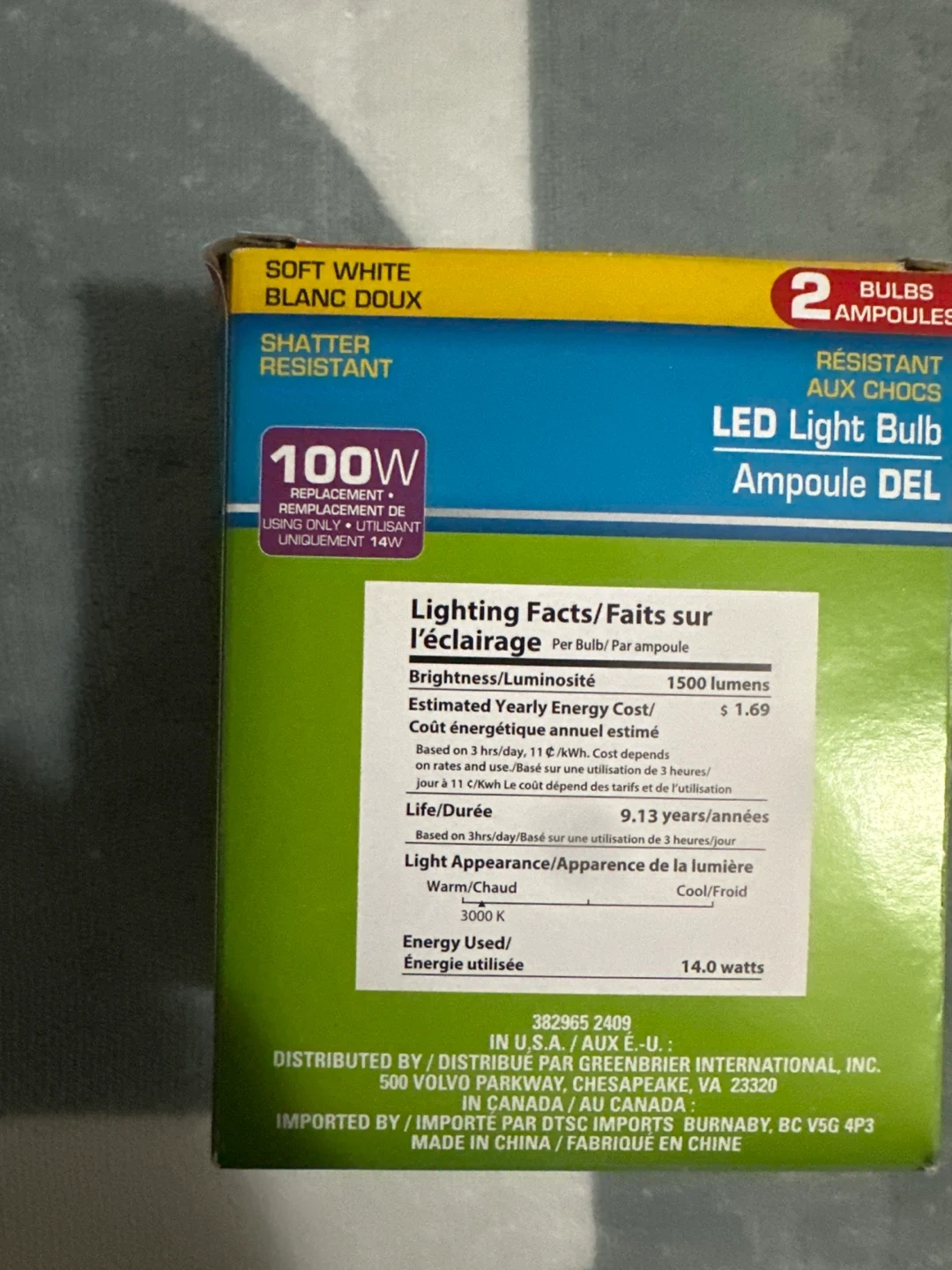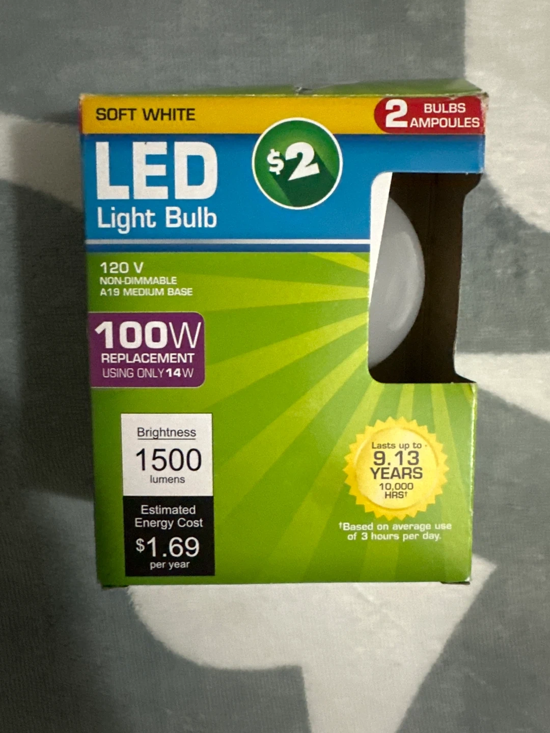 Selling a pack of 2 LED light bulbs. They are soft white and shatter resistant. Each bulb is a 100W replacement using only 14W. They provide 1500 lumens of brightness and are estimated to cost $1.69 per year to operate based on 3 hours of use per day