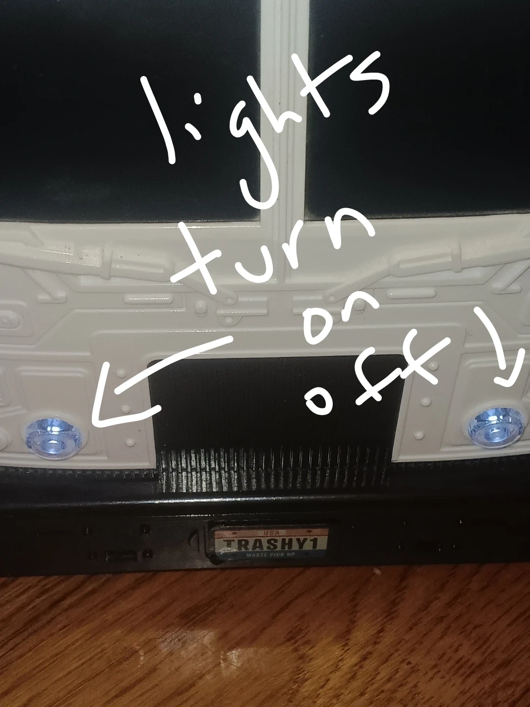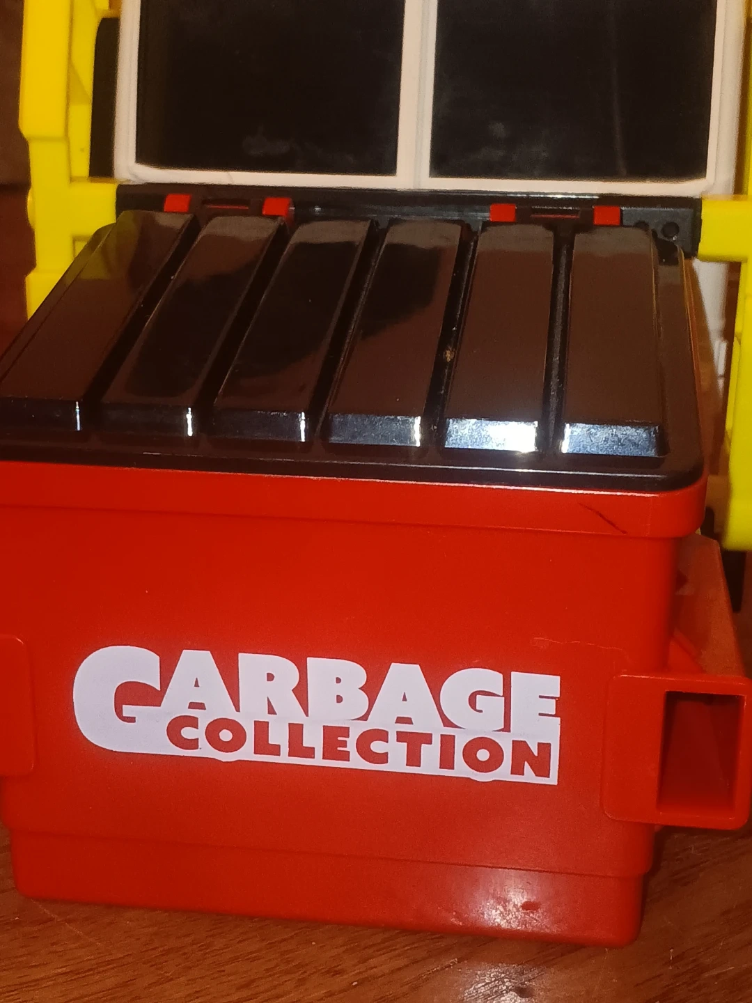 Selling a toy garbage truck with a red dumpster. It's in good condition and ready for a new home! Features include a green garbage truck with a recycle logo and a yellow caution sign on the back. Lights turn on.