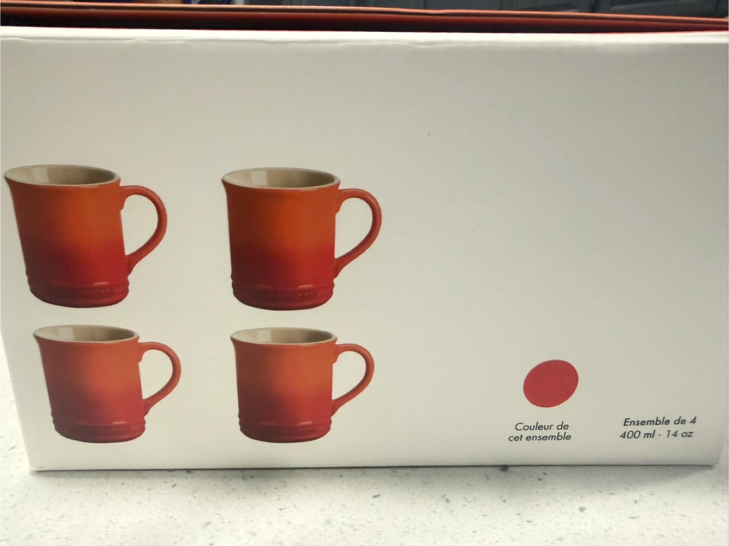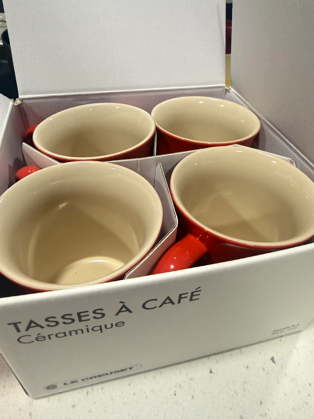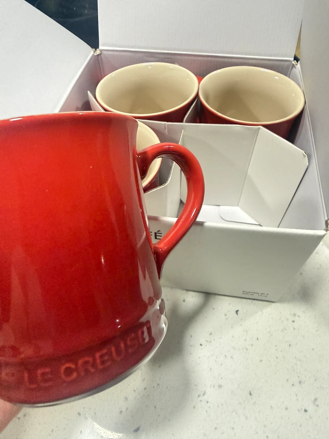 Brand new Le Creuset set of 4 mugs in a vibrant red colour. They come in the original box. Each mug has a capacity of 400 ml or 14 oz. Perfect for enjoying your favourite hot beverages!