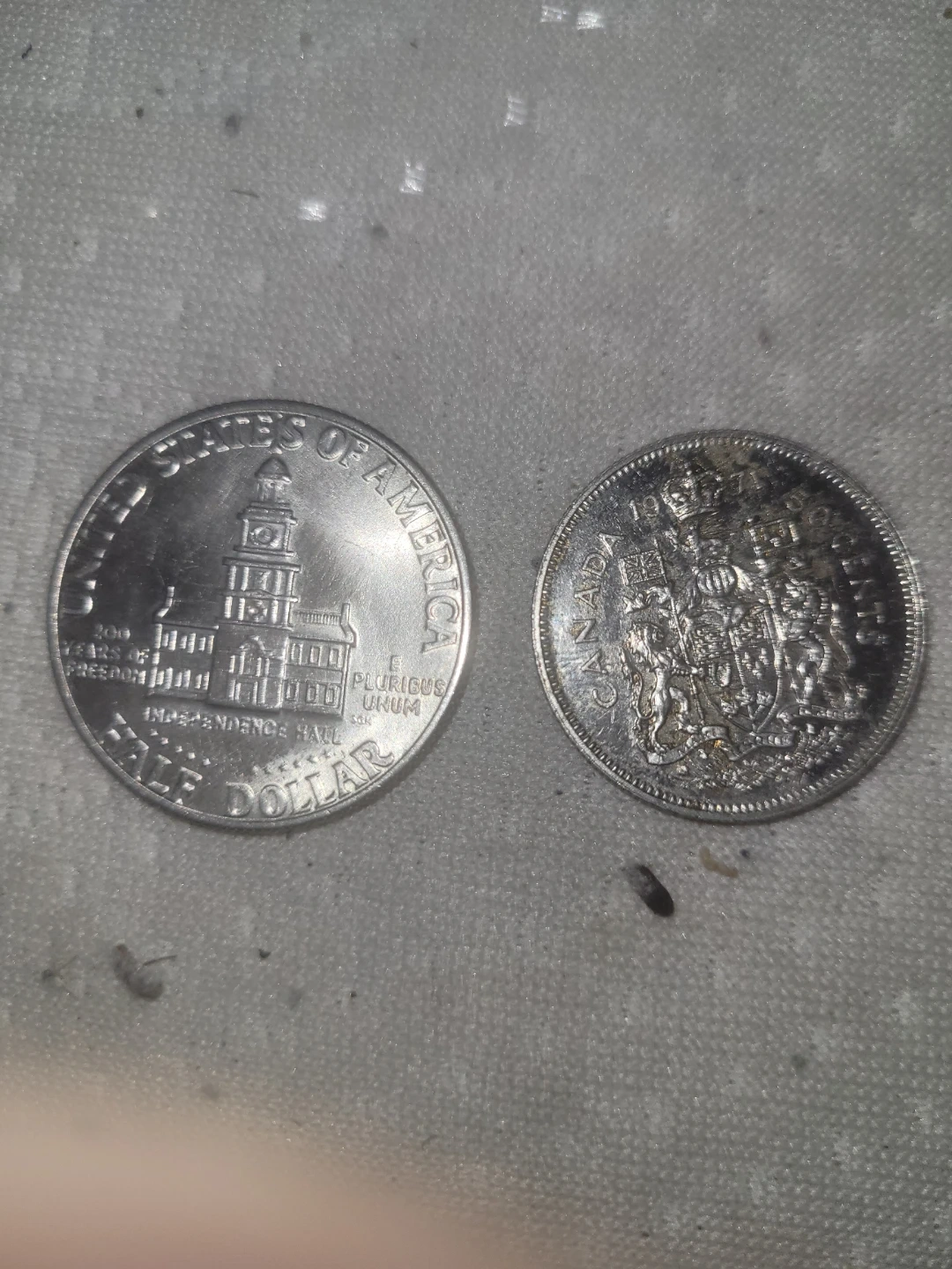 Selling a 1976 United States Half Dollar coin alongside a Canadian coin. Both coins show signs of wear, as pictured. Great for collectors or anyone interested in numismatics!