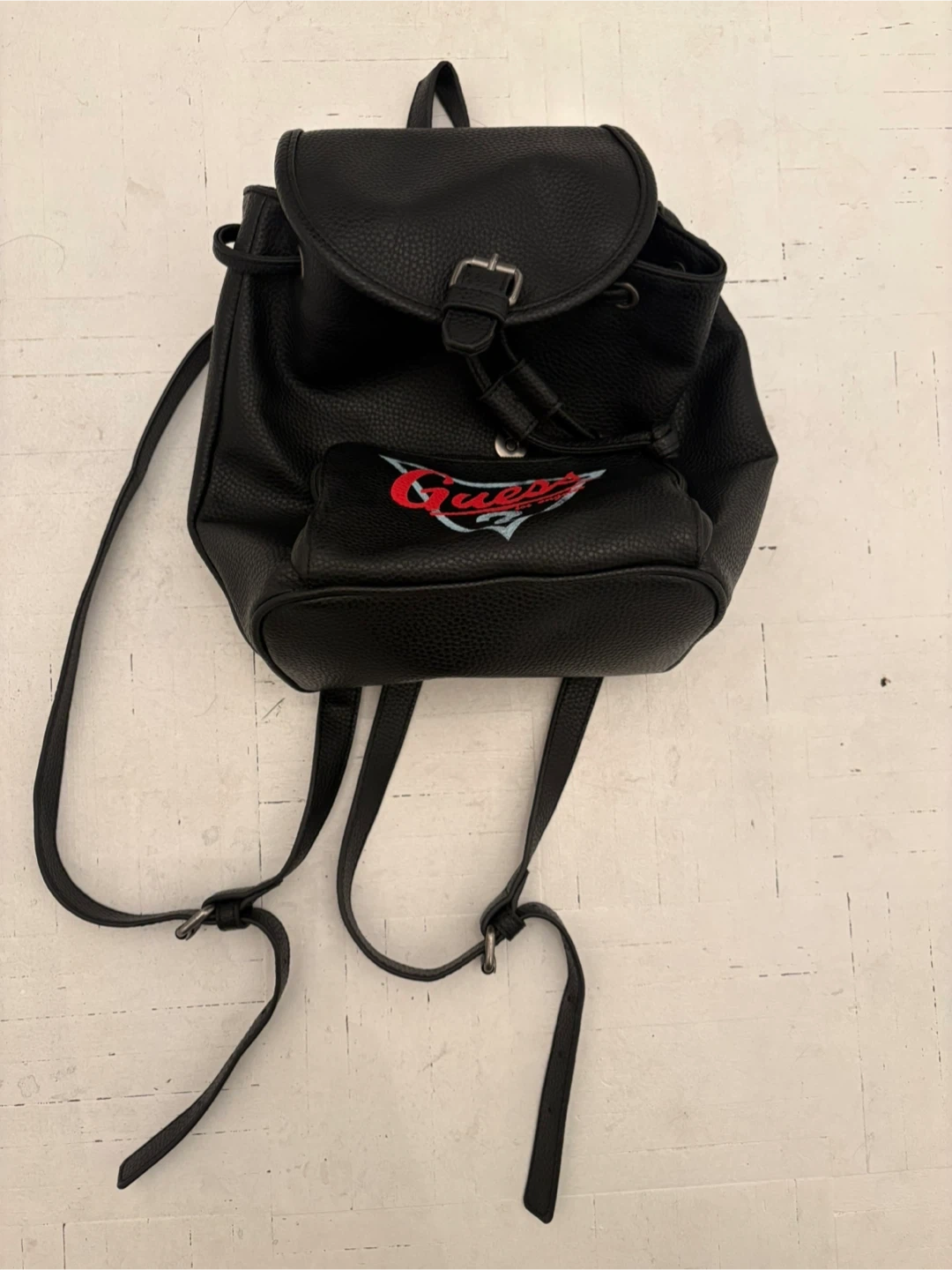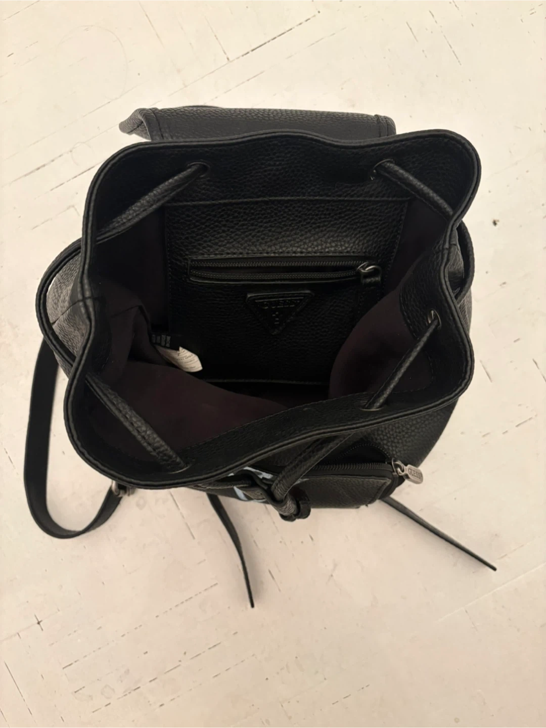 This is a cute Guess mini backpack in black leather! It's a stylish and compact bag, perfect for carrying your essentials. The backpack features a drawstring closure and a flap with a buckle for added security. It's great for everyday use or for adding a trendy touch to your outfit