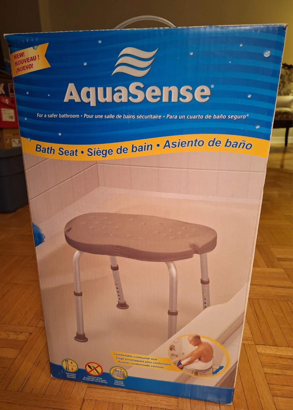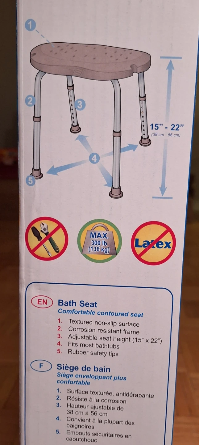 AquaSense Bathtub Seat. Adjustable seat height 15" to 22". Maximum weight 300 lbs.
